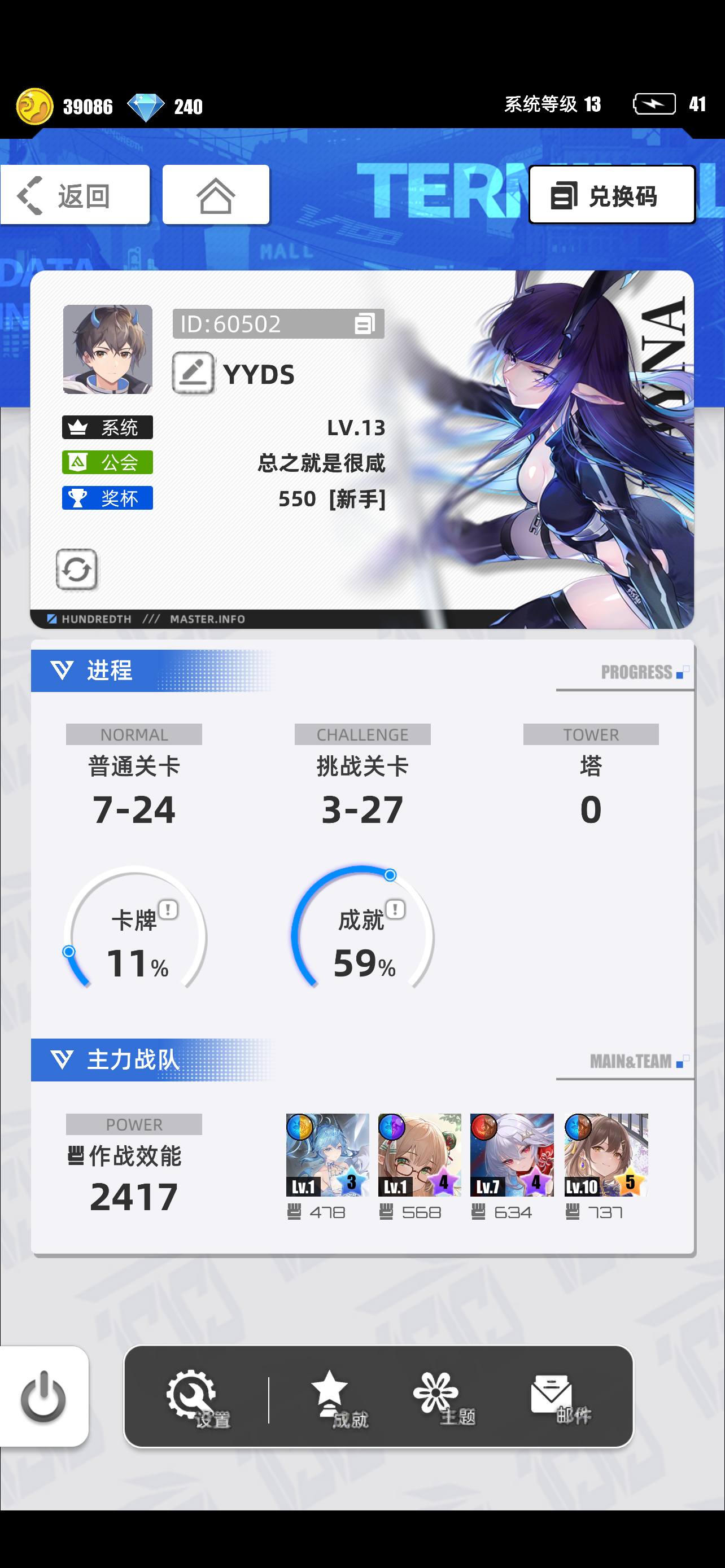 游戏名称:百分之一 发售平台:TapTap 游戏时间:累计时长三天左右推荐人群:上班族、休闲党,消消乐兼二次元精品卡牌立绘收集题材爱好者游戏体验:目前阶段玩着有点懵,迅速的加了群寻求大佬帮助,初心想白嫖兑换码,也是考了一波古,发现都过期了,原来是上古时代的产物,不肝,整体上休闲摸鱼体验挺好(上班还是竖屏摸鱼好)许愿六星卡牌:冷落雪 游戏名称:YYDS账号ID:60502#我的百分之