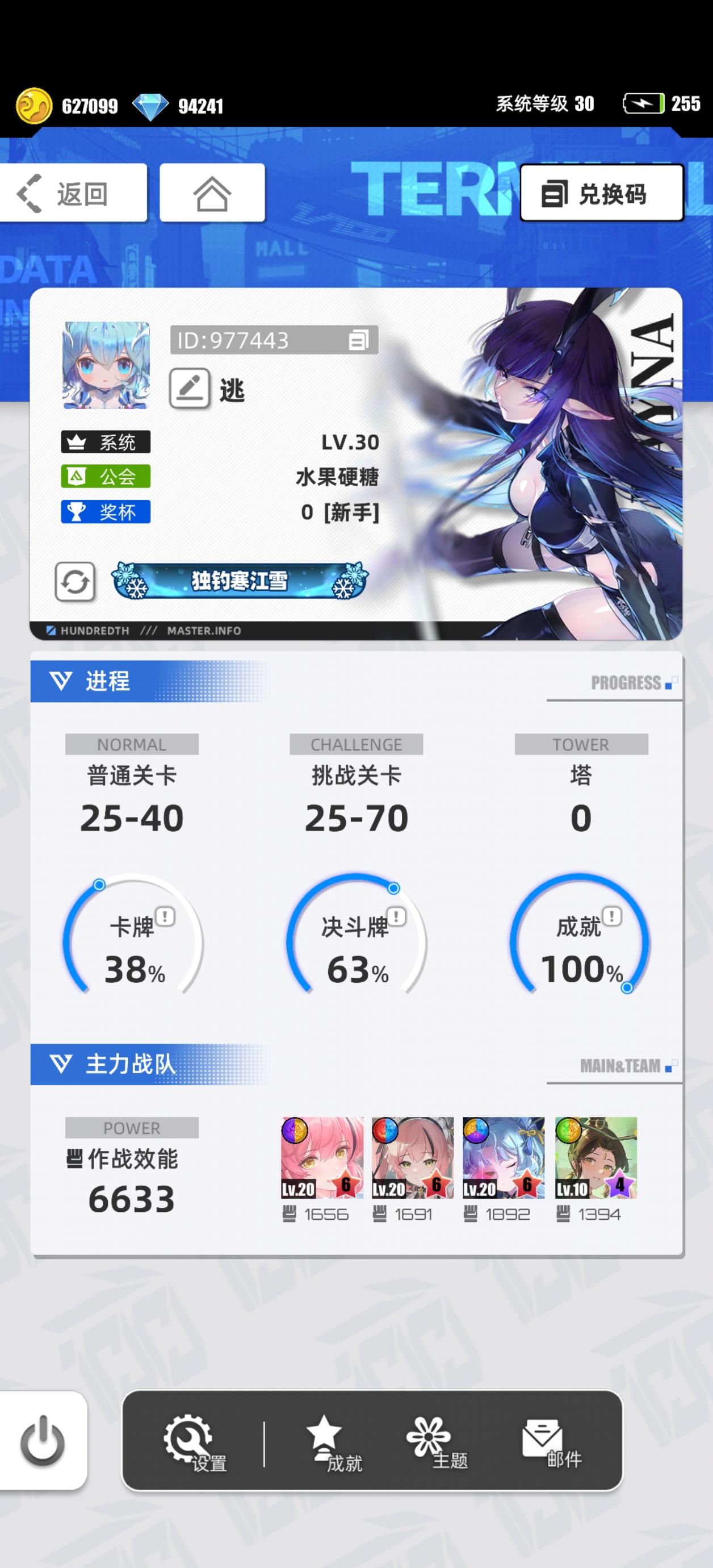 游戏名称:百分之一 发售平台:TapTap 游戏时间:刚玩不久 (目前) 推荐人群:抽卡,养老 ,养成,三消。 游戏体验:本来是因为手机性能太差,打算找一个休闲养老点儿的游戏,看到这个还不错就入坑了。结果这个游戏给了我这个牌佬兼龙癌晚期患者巨大的震撼。玩起来一发不可收拾,立绘和声优都很上头,各种小玩法也挺有意思。awsl…… 许愿六星卡牌:代号P*冷落雪 游戏名称:菘蓝账