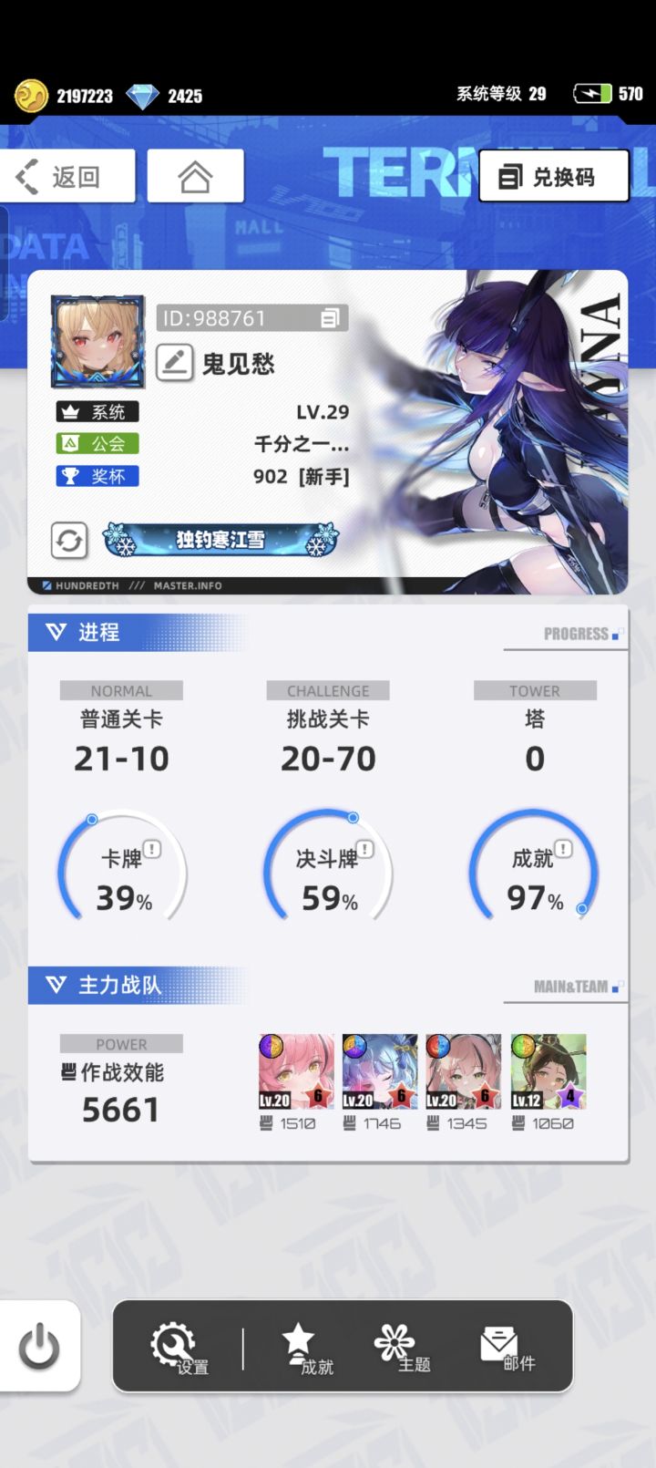 游戏名称:百分之一 游戏平台:TapTap 游戏时长:萌新玩家 适合人群:上班族 休闲党 游戏体验:从内测卡牌对战开始第一次接触,后面改成消消乐被劝退(那时候不爱玩消消乐),现在想回来再尝试一下,发现也挺适合上班摸鱼游玩,可以自动战斗,压力也不大,没有很多pvp,目前会继续尝试玩下去。许愿六星卡牌:代号P·冷落雪 安卓官服 游戏名称:黎烁 帐号ID: 72555