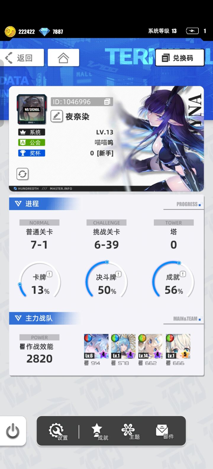 #我的百分之一 游戏名称:百分之一 游戏平台:TapTap 游戏时长:萌新玩家 适合人群:零/微氪党 休闲党 游戏体验: 一直在找竖屏休闲游戏玩,很早前久关注到这个游戏了,但是一查攻略都说要有冷落雪,之前上班嫌麻烦懒得参加这活动,过年有空了入坑来看看许愿六星卡牌:代号P·冷落雪 安卓官服 游戏名称:萌新瑟瑟发抖帐号ID: 1052173