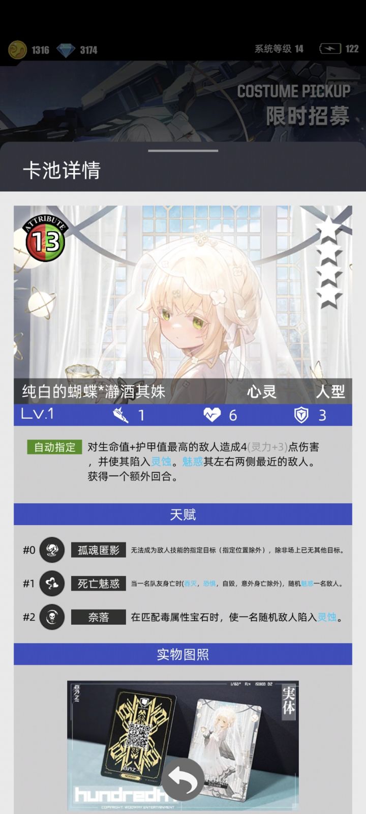 游戏名称:百分之一 游戏平台:TapTap 游戏时长:新人玩家 适合人群:零氪党 休闲党 游戏体验:福利很好的游戏,刚入坑就有很多抽,足够把当期池子都抽一遍,里面的女角色也都很好看。 许愿六星卡牌:代号P·冷落雪 游戏id:塞勒寂地帐号ID:1052127 #百分之一 Tap官服下载