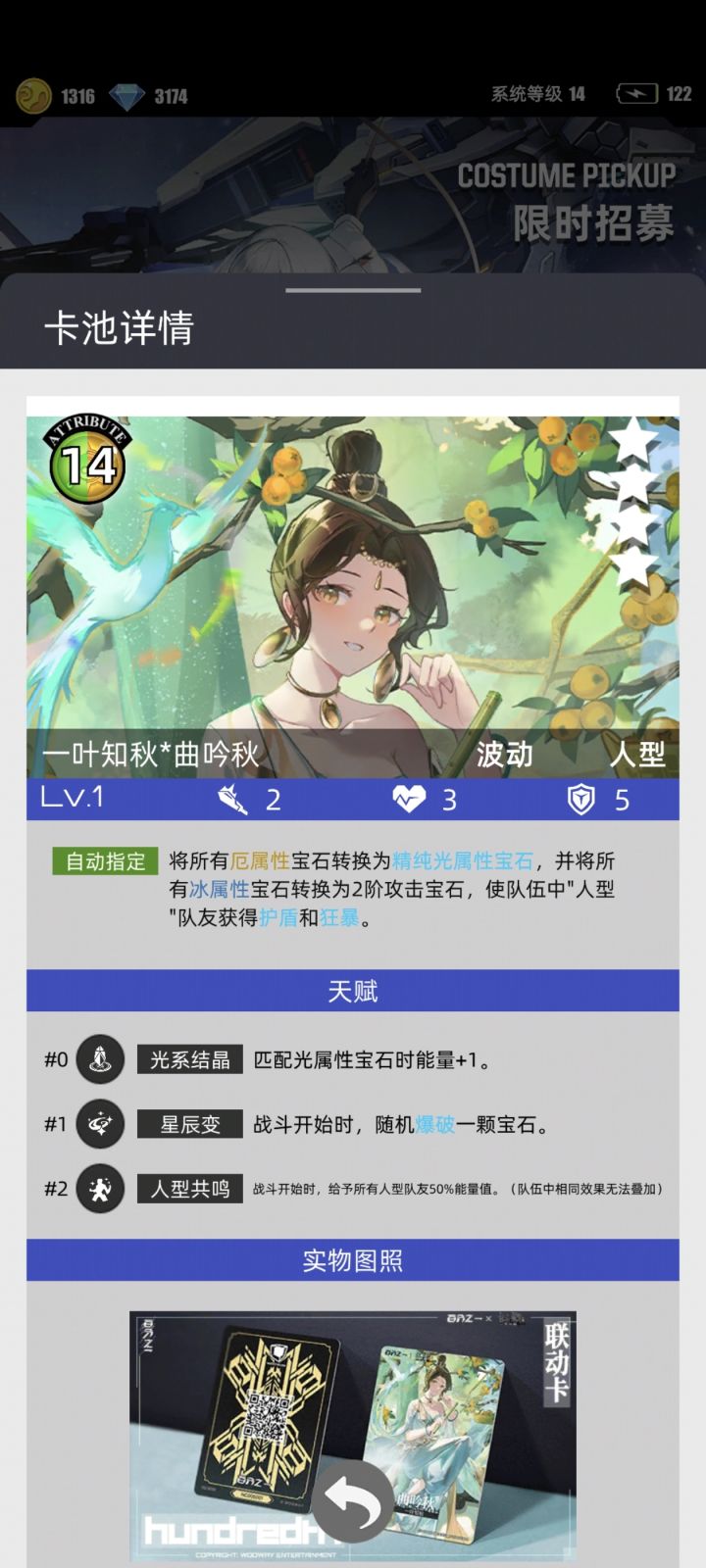 游戏名称:百分之一 游戏平台:TapTap 游戏时长:回归玩家 适合人群:零氪党 休闲党 游戏体验: 我本人还是个小菜,没啥具体游戏介绍,只能分享一下我的感受了,嘿嘿。这个游戏当时是在tap里面闲游的时候看到推荐,几次波折都没有下载。后面一时兴起,本着试一试的心态,入了百分之一的坑。刚开始送了什么我也记不得,反正觉得福利还不错,抽到卡牌啥也不会,幸好有个推荐搭配,刚开始还以为是固定的,后面