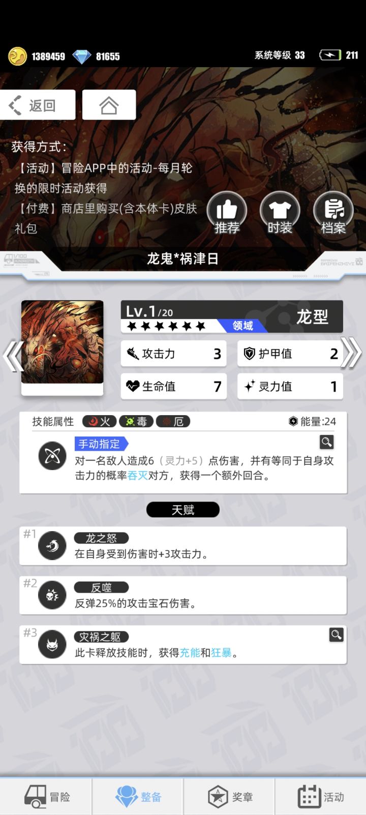 游戏名称:百分之一 游戏平台:TapTap 游戏时间:大学 推荐人群:老少皆宜 游戏体验:休闲为主,压力不大,找个活跃公会最重要,抽卡爆率不错,不会经常卡保底出,较为休闲。许愿游戏六星卡牌:龙鬼*祸津日 游戏名称: 潇潇暮雨 帐号ID: 182709 区服:安卓