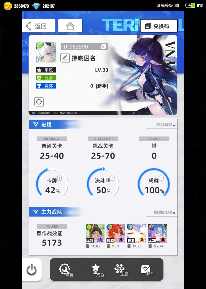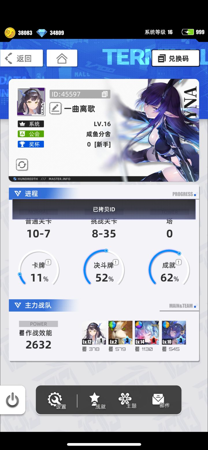 #百分之一 #我的百分之一 游戏名称:百分之一 发售平台:TapTap 游戏时间:大学时间 推荐人群:上班族学生党 游戏体验:最近比较迷的三消游戏,这个游戏玩起来还是很舒服,就是不知道怎么得5⭐6⭐卡,立绘很喜欢,卡牌太多选择困难症。资源收集比较困难,继续摸索中。 许愿六星卡牌:代号S*妮雅 游戏名称:拂晓囚名 账号ID: 963590