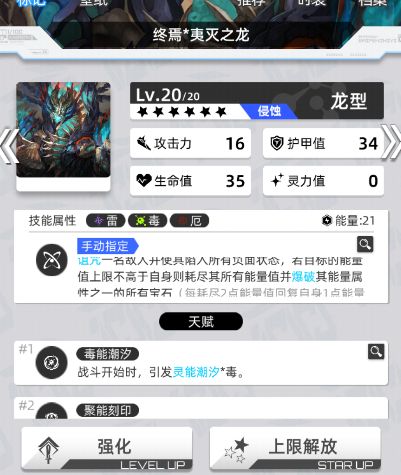 终焉龙的技能乍一看可能感觉是个废物六星标配,看着感觉没太大用,实战还真不是。天赋也是不错,自带毒潮汐,可以顶替毒系提供潮汐位置的卡,让队伍更能连起来。把终焉龙作为一号位或者副充,个人认为还不错,之前超弦测试的时候基本上是一个技能可以充满。不过暂时没有相关属性了,所以没有实战截图。配队的话,大概火雷有一个队伍三个神带一个也还不错的辅助,还是可以的,玩起来挺流畅。七头龙的天赋为终焉龙增加另一