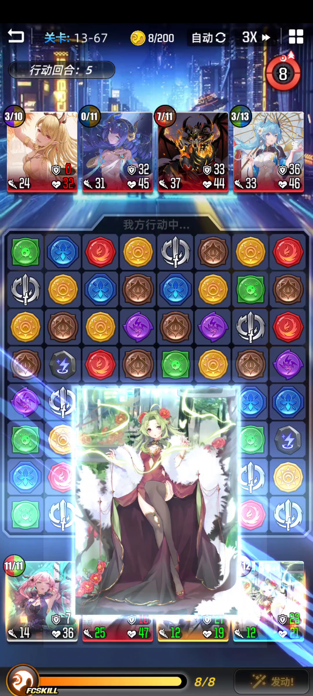 也是因为新卡带的火潮汐在论坛看到了以小神为核心组成的火队在这之上添加了一些私货(没错就是我的诺恩(ฅ∀<`๑)♡) 原理很简单,原本以为诺恩还得等光潮汐的光队才能尝试使用,但是小神在火潮汐下大概率的四消中光四消占比并不小,能够很快的将诺恩的伤害叠起来,让她有了一点点硬玩的强度。 使用时注意小神的高效宝石创造有时会使棋盘出现80%左右的火光宝石,这时再次释放技能已有的火光宝石不会再度创造,就有可能出现断连,可以用塔维拉的技能把光转火保连动。 优势:有诺恩的伤害叠加打起来比其他火像什么白希之类的快(当然比不过芙,但芙有的不多嘛)而且诺恩的厄宝石创造有时候也能四消不断回合且帮小神充能。而且被托雷惯坏了的我超弦没额外回合打起来真的痛苦ଇ,而且新卡能保证潮汐,保证诺恩放完技能断连了,小神再启动的时候不会没潮汐用。 缺点:要用诺恩打伤害的时候依旧很大概率断连,而且诺恩不像冰龙不能穿甲,三四百的灵力值看似高但是实际伤害很一般,而且本身火潮汐加上小神大量光火宝石的创造,厄宝石少得很难连上,低层速度都一般高层更是不快。 个人感觉还是有点小前途的,高层对面离谱的数值下真不敢让对面动几次,要么舍弃回合换伤害要么缺伤害的毒点只能等后续的卡,当然如果盛总愿意加强诺恩的话(穷图匕见)如果能把创造厄宝石换成创造光宝石的话再加那么一两颗的创造数量,这样那怕没有穿甲真伤也能保证尽力不断连的情况下打出不错的伤害,如果还是打击连动的环境的话不要散射改成单体伤害让我起码断一次连换一次也许能减员一人的高输出也行。最后盛总答应要加强了看看到时候能不能拯救一下这张卡吧。