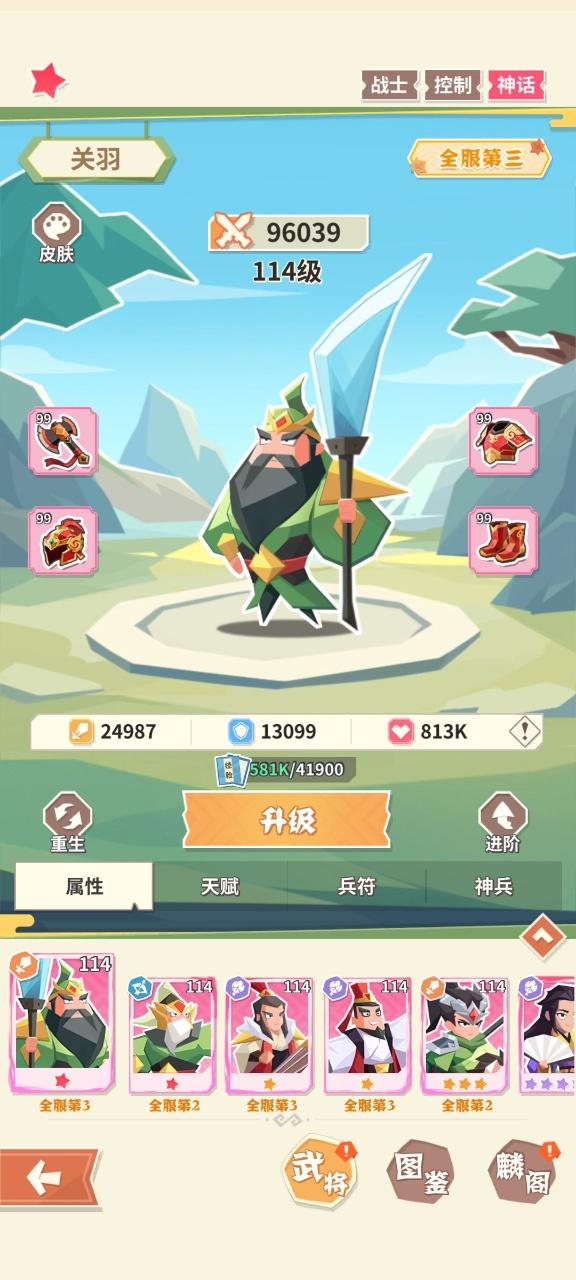 区服: 9服 游戏ID: 23001100910108 角色名:斩月 开局跟着主线走,菜刀队建议首充拿个赵云前期推图很顶,缺点是推图快的话2天后就疲软了,没有击退抗性之前,菜刀队很难越战推图。 前期推图没什么压力,爬塔推图拿卷抽卡开心愿,阵容的话看你抽到什么红将,郭嘉前期输出很猛,但是8天后开了神兵就变成辅助了,如果主C郭嘉的话那么一定要心愿另一个C以后替换,关羽是必拿的, 目前这个版本除了烧火队