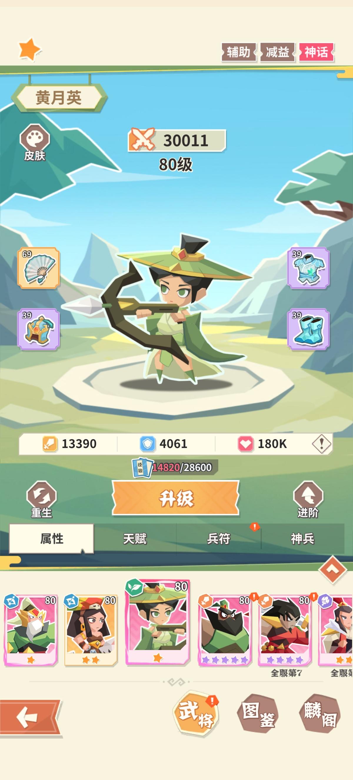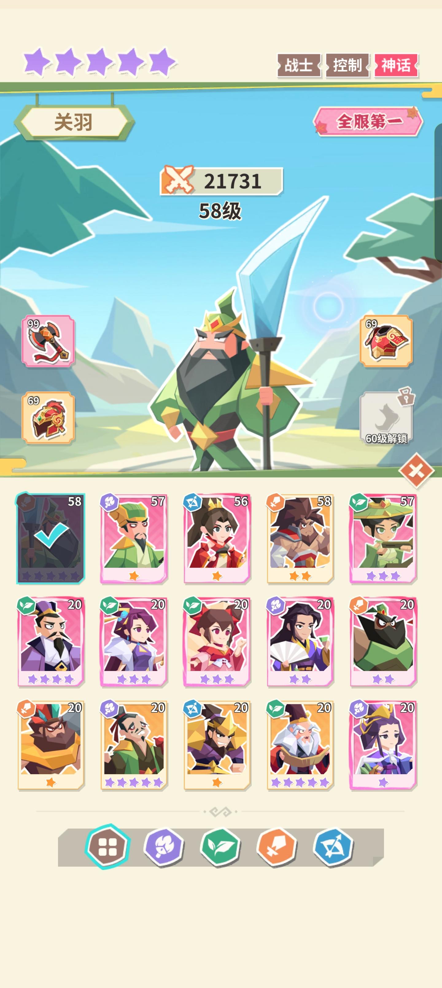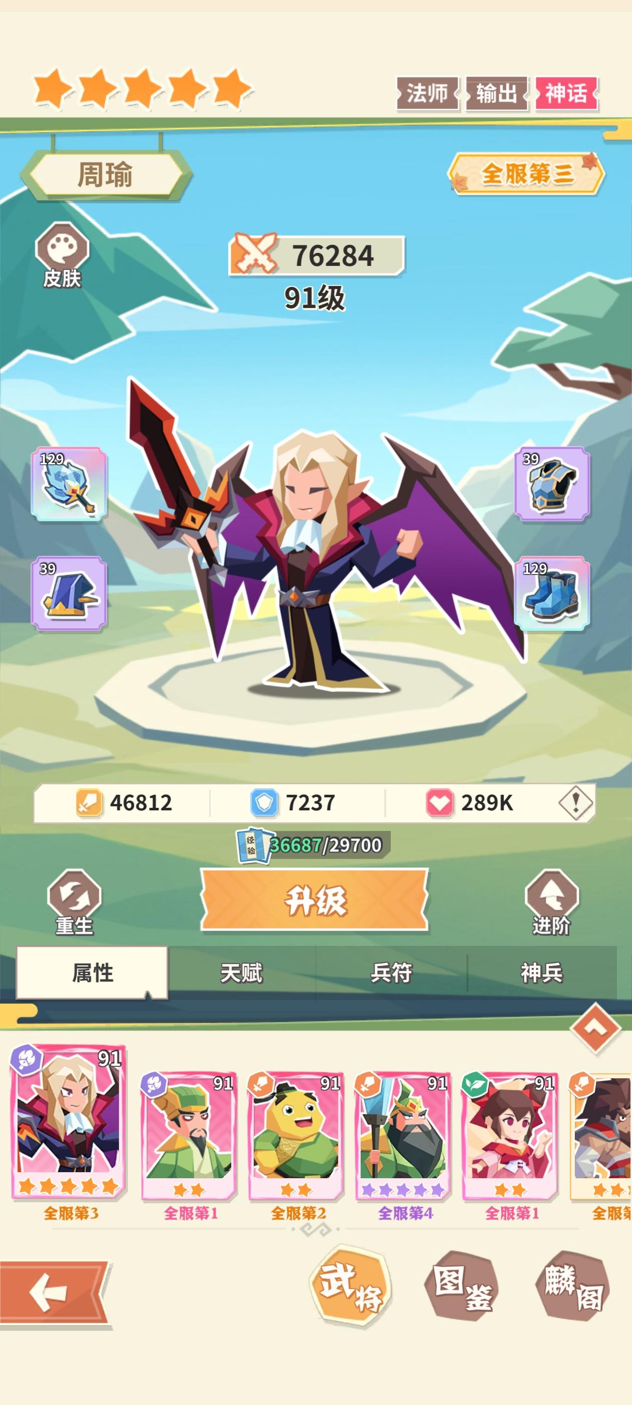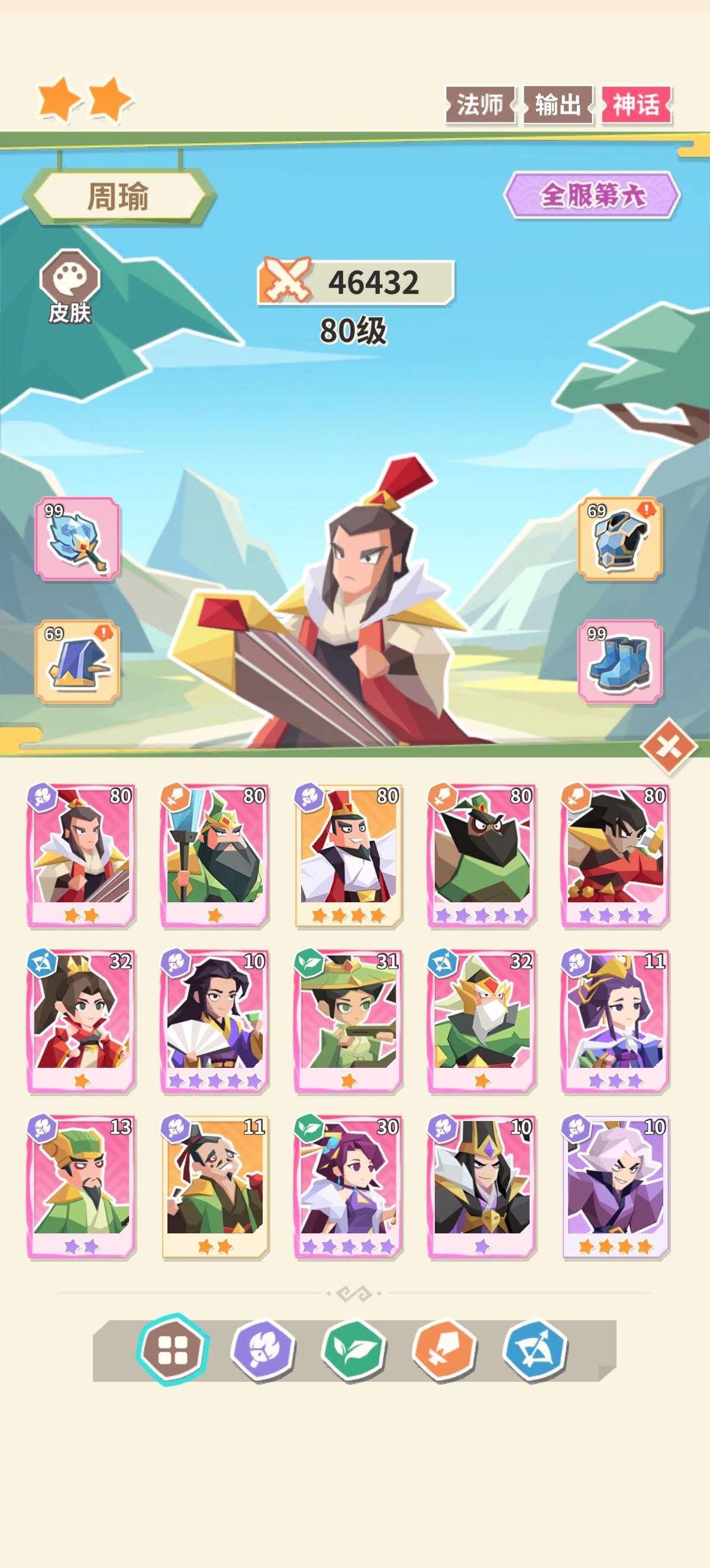 1区 剑气长ID2301100110337前言:这个游戏的可玩性还是非常多的,喜欢三国题材游戏的强烈推荐,作为一个氪佬因为第一次玩走了很多弯路所以分享一些避坑心得一. 阵容这个游戏最推荐的阵容就是战法,三战士两法师前期法师推荐周瑜诸葛和鲁肃(缺法师可以把鲁肃进阶为神话品质,前期推图爆发很高)建议堆一个极限战力诸葛或者周瑜那个星高倾斜资源重点培养,战士推荐张飞,关羽,黄盖,周泰(赵云没用别
