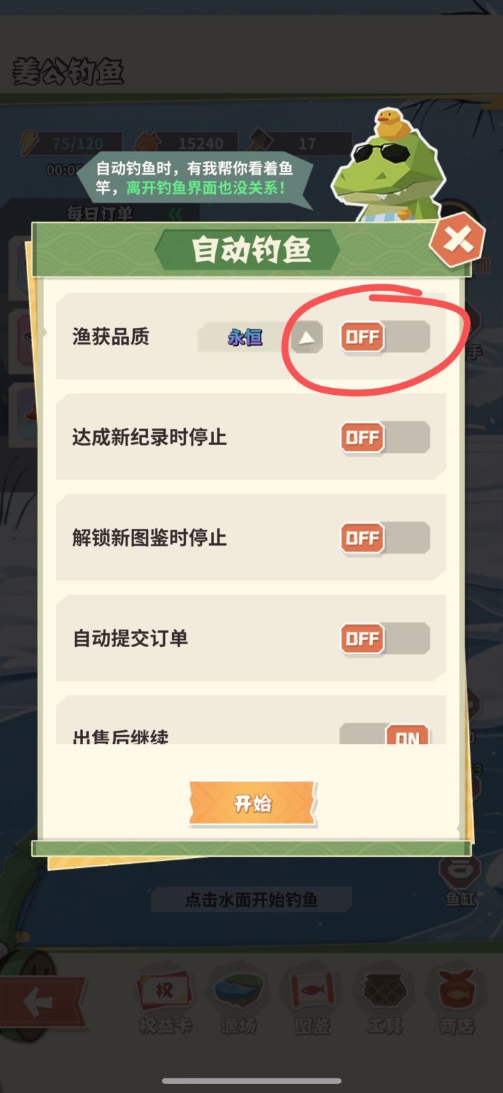 钓鱼任务有红鱼但是不想提交大鱼做任务?可以把自动的品质关闭开启自动,就会把鱼卖了