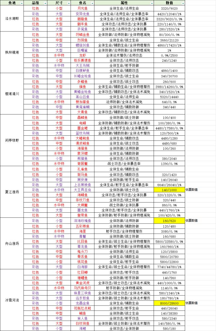 目前图全开完了,但是鱼还没掉全,有之前钓的鱼没截图,等我再钓上来会补在这个帖子里。(只补充红,彩鱼)整理了表格,方便大家观看,有些鱼属性不记得了,后续钓上来会补在表里。文档链接如下,大家可自行筛选查阅【金山文档 | WPS云文档】 勇敢幻想钓鱼属性https://www.kdocs.cn/l/csMPelJkv7Un #勇敢幻想全民晒图 #勇敢幻想