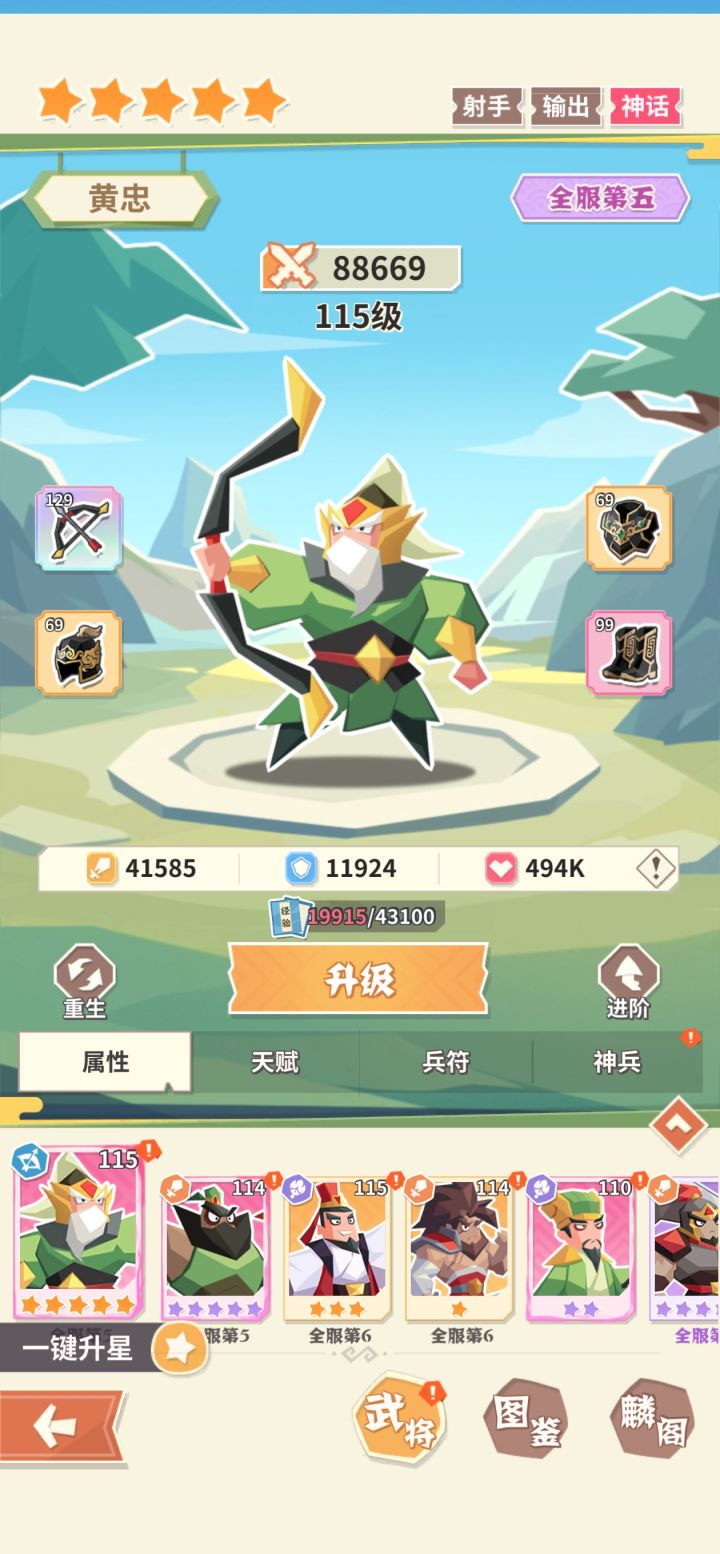 主流搭配:3战2法或2战3法近战角色:关羽,张飞 辅助角色:没高星可上可不上,回血辅助不建议,前中期用处不大。 输出角色:游戏输出分两种,射手和法师,射手目前只有两个,前期黄忠很厉害,单点秒杀脆皮,可以让敌方迅速减员 法师前中期周瑜跟诸葛亮最优选,AOE技能输出全体 不过看个人运气吧,前中期那个星高尽量用那个,稍微搭配下就行 橙色的也有几个不错(比如大帝或周泰),紫的徐盛也不错,其他可