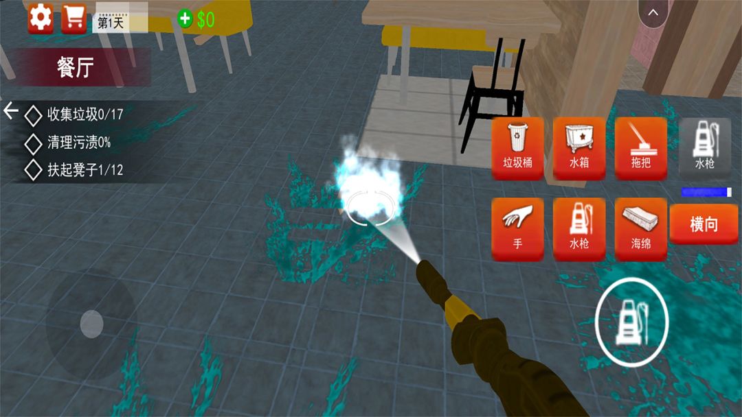 游戏中的清洁不同于以往认知中的保洁工作,而是清理餐厅现场,你需要通过独特的技能组合以及全套的清洁工具,在有限的时间内清理餐厅现场的污渍。另外,游戏还设计了多样的清洁工具,以及关卡地图场景,玩家可通过赚取的金钱进行解锁,以此更好地清理整个餐厅现场。你准备好接受挑战了吗?