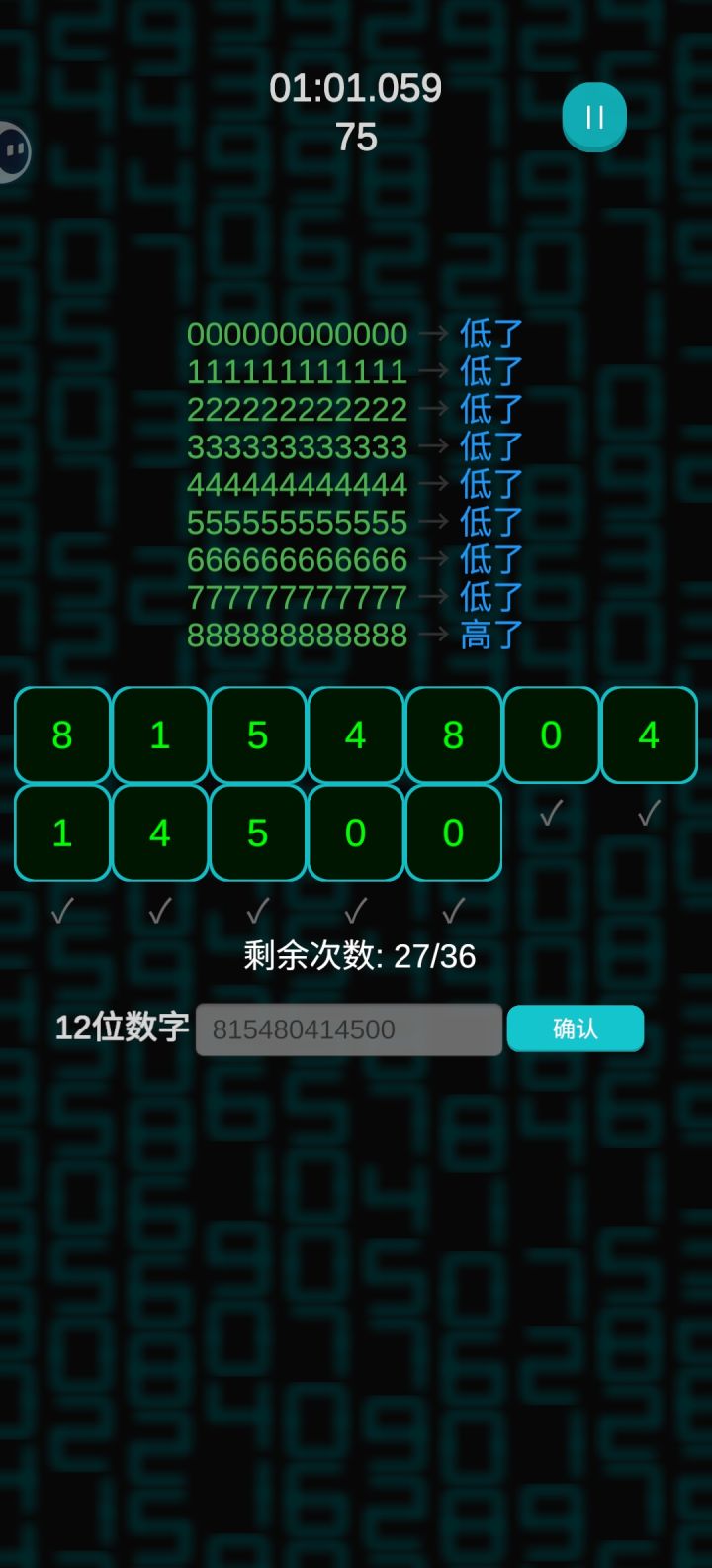 好玩,蛮有意思的,掌握了技巧之后,就没啥难度,我觉得可以更新一下,一个是突破位数,可以无限猜下去,猜到20位都可以😅,或者提示可以更加模糊,第一行的提示被覆盖,我估计是故意的,增加难度吧,但是试几次总归都可以试出来。总而言之,可以试一试