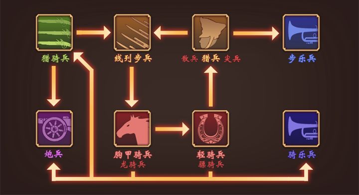 严格按照克制表来战斗,才能以少打多。就好比主角是线列步兵,武艺天下无双,但同时对线2个猎兵也得败下来。克制后基本可以攻击2次。最核心记住:步>重>轻>猎>步 这个循环就可以了。猎骑兵比较少,而且输出不高,步兵够刚猛的话可以和猎骑兵掰手腕。