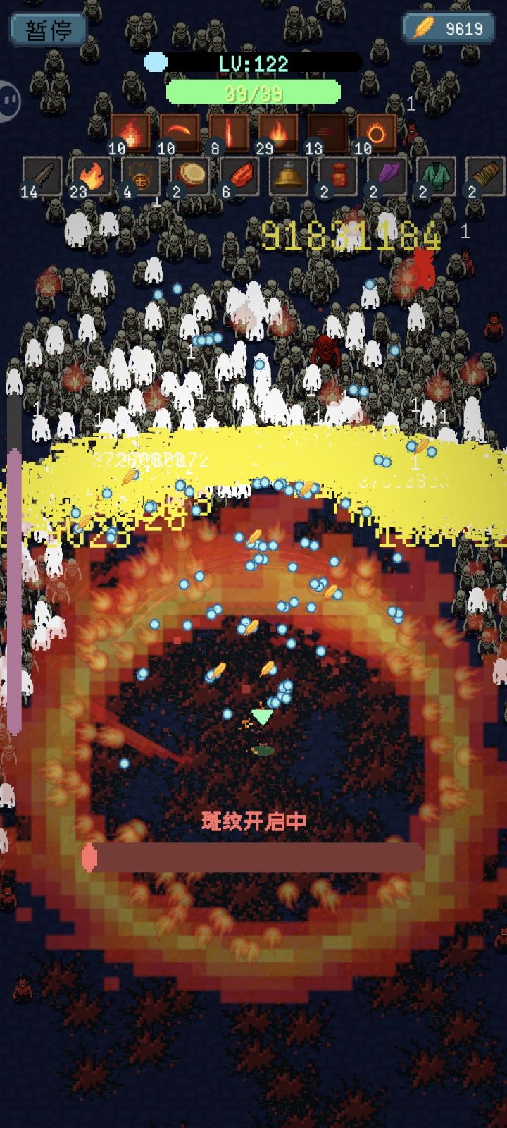 。。。玩到,150多级奔溃了143级就伤害显示负了,后边开不开班纹已经没什么意义了,加不了多少伤害,主要是攻速快,没宝剑升几次冷却就不需要斑纹了。5w多羽毛没了