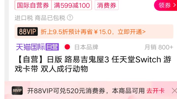 最近刚刚入手了switch,然后就开始了买卡之旅,准备一步一步的去收藏那些卡带,就跟我收集tap上的买断付费游戏一样。我入手了塞尔达与动森。还看了看马里奥系列,但是没有入手,马里奥赛车8,马里奥派对,马里奥超级巨星派对,这些我都没有入手呢,这个等618的时候再买我看上了这个路易吉鬼屋3,这个300多的卡带,现在天猫国际正好有优惠,有活动啥的。不用300多,200多就能买,二百九九,便宜了50块钱