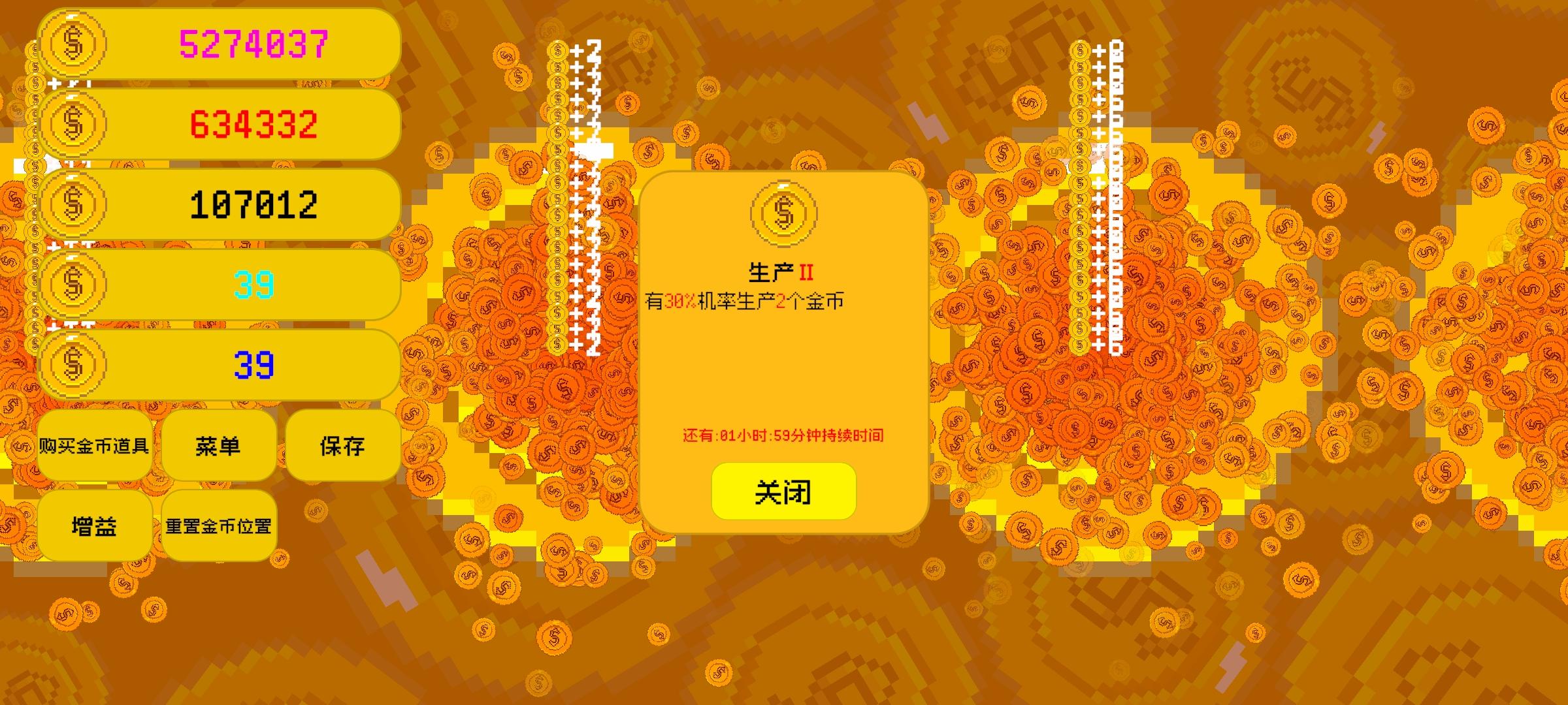 游戏机制:开始设计这款游戏时以放置挂机为核心玩法设计的,游戏内金币道具会在每隔一段时间自动产出金币,你可以利用金币升级你的金币道具,升级后的金币道具会提升生产效率及减少生产时间,等级是有上限的目前是15级,但是后续可能会对其做调整,在几天后会进行篝火测试欢迎大家一起来玩,之后的一些内容都是围绕核心玩法设计的有增益,每日任务,成就等,增益机制增加了游戏的策略性你需要在三组增益中选择一种,增益效果会持