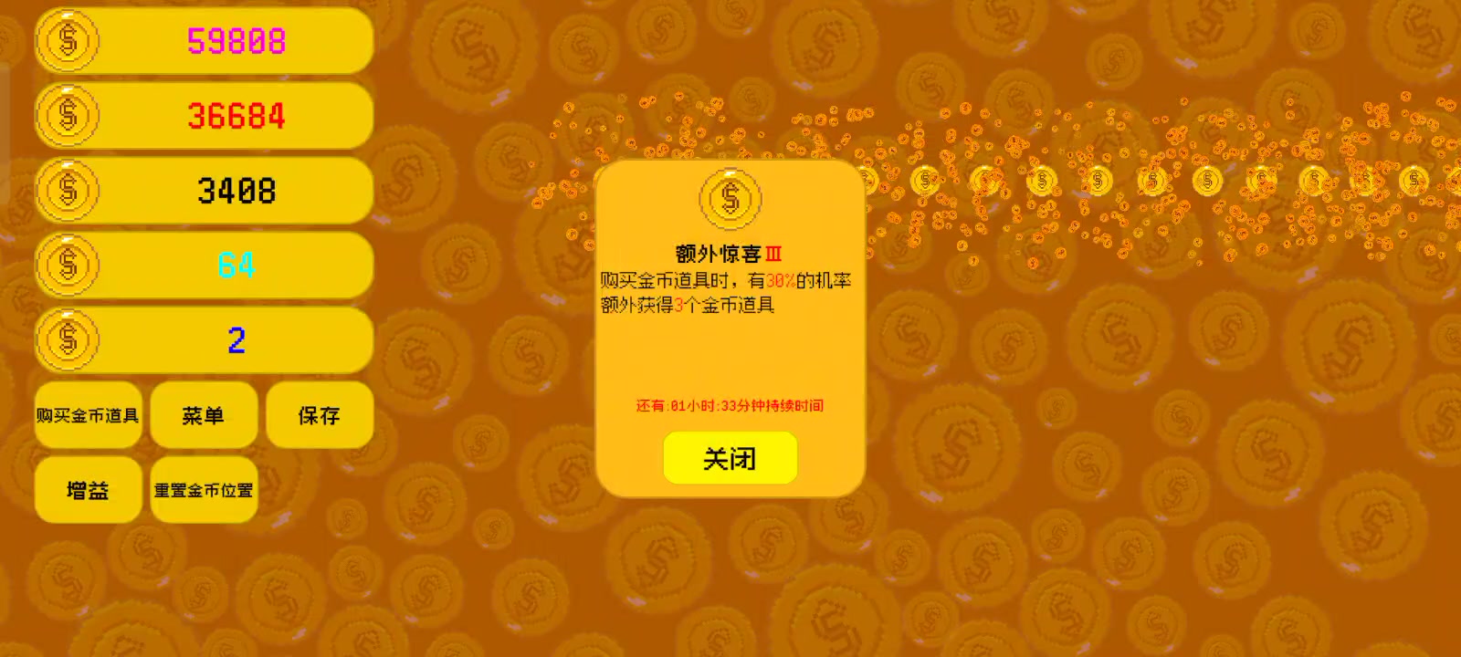 游戏机制:开始设计这款游戏时以放置挂机为核心玩法设计的,游戏内金币道具会在每隔一段时间自动产出金币,你可以利用金币升级你的金币道具,升级后的金币道具会提升生产效率及减少生产时间,等级是有上限的目前是15级,但是后续可能会对其做调整,在几天后会进行篝火测试欢迎大家一起来玩,之后的一些内容都是围绕核心玩法设计的有增益,每日任务,成就等,增益机制增加了游戏的策略性你需要在三组增益中选择一种,增益效果会持