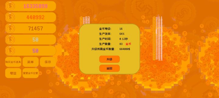游戏机制:开始设计这款游戏时以放置挂机为核心玩法设计的,游戏内金币道具会在每隔一段时间自动产出金币,你可以利用金币升级你的金币道具,升级后的金币道具会提升生产效率及减少生产时间,等级是有上限的目前是15级,但是后续可能会对其做调整,在几天后会进行篝火测试欢迎大家一起来玩,之后的一些内容都是围绕核心玩法设计的有增益,每日任务,成就等,增益机制增加了游戏的策略性你需要在三组增益中选择一种,增益效果会持