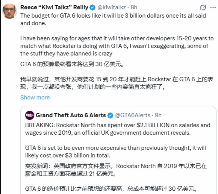 游戏博主Reece “Kiwi Talkz” Reilly最新爆料,《GTA6》完工后的总预算预计达到30亿美元,折合人民币约207亿元,创下游戏行业开发成本新纪录。他表示,其他开发商想要追上 Rockstar 的制作水准,或许需要15至20年时间。该成本预估得到英国政府官方文件佐证,文件显示Rockstar North自2019年起员工薪资支出已超 21 亿美元,外界据此判断《GTA6》总成本