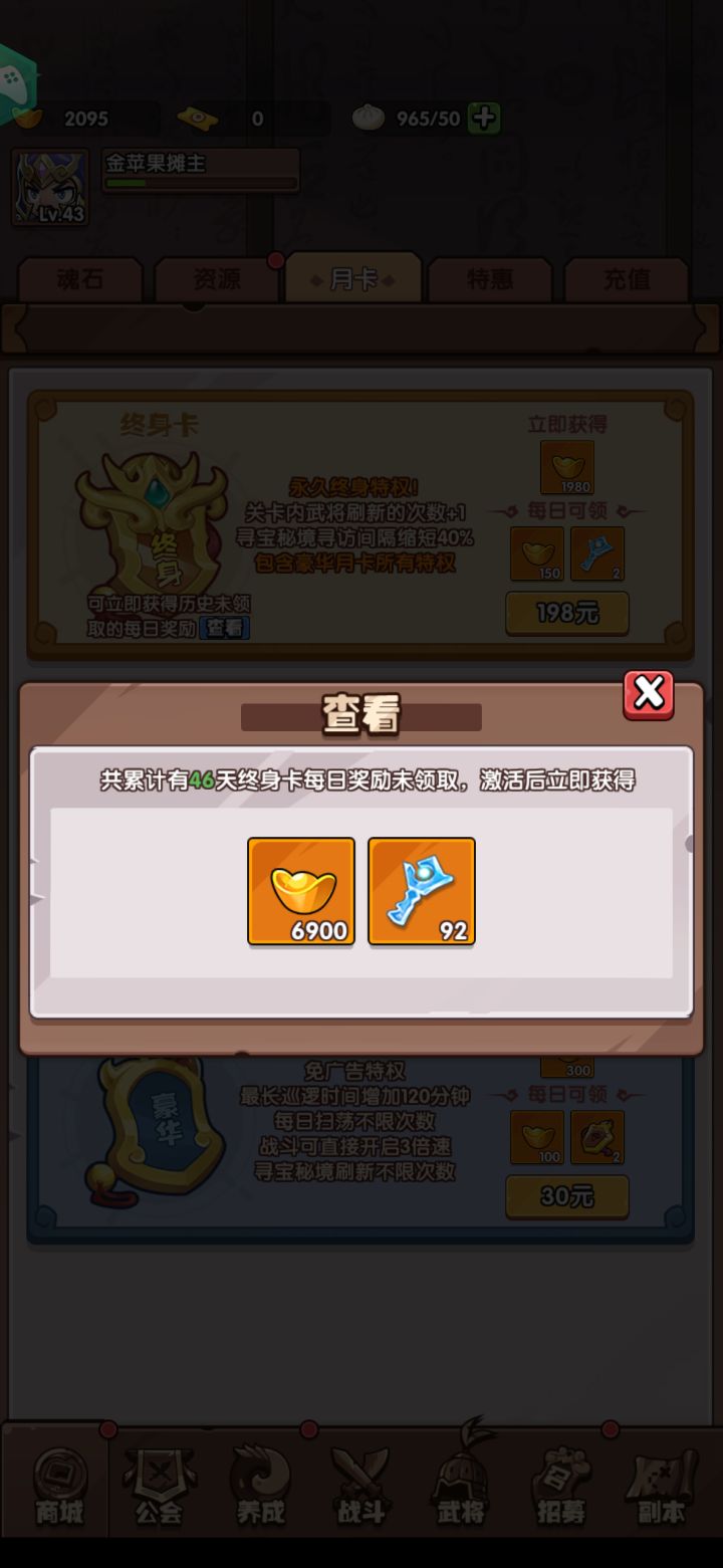 1.签到,30天获得7-8招募令、6史诗钥匙、500元宝、天赋点与武魂2.3.4.商城广告,每天1史诗钥匙、1普通钥匙、20元宝、6体力5.广告体力,15=5*3;午间与晚间体力补充30=15*26.每日挑战每天2招募令7.圣兽挑战按前十名算每周4000积分保底(20招募令)8.过关斩将每天1招募令(建议200元宝买两次,多得2招募)9.远征每周20神器钥匙10.11.每日广告抽2次