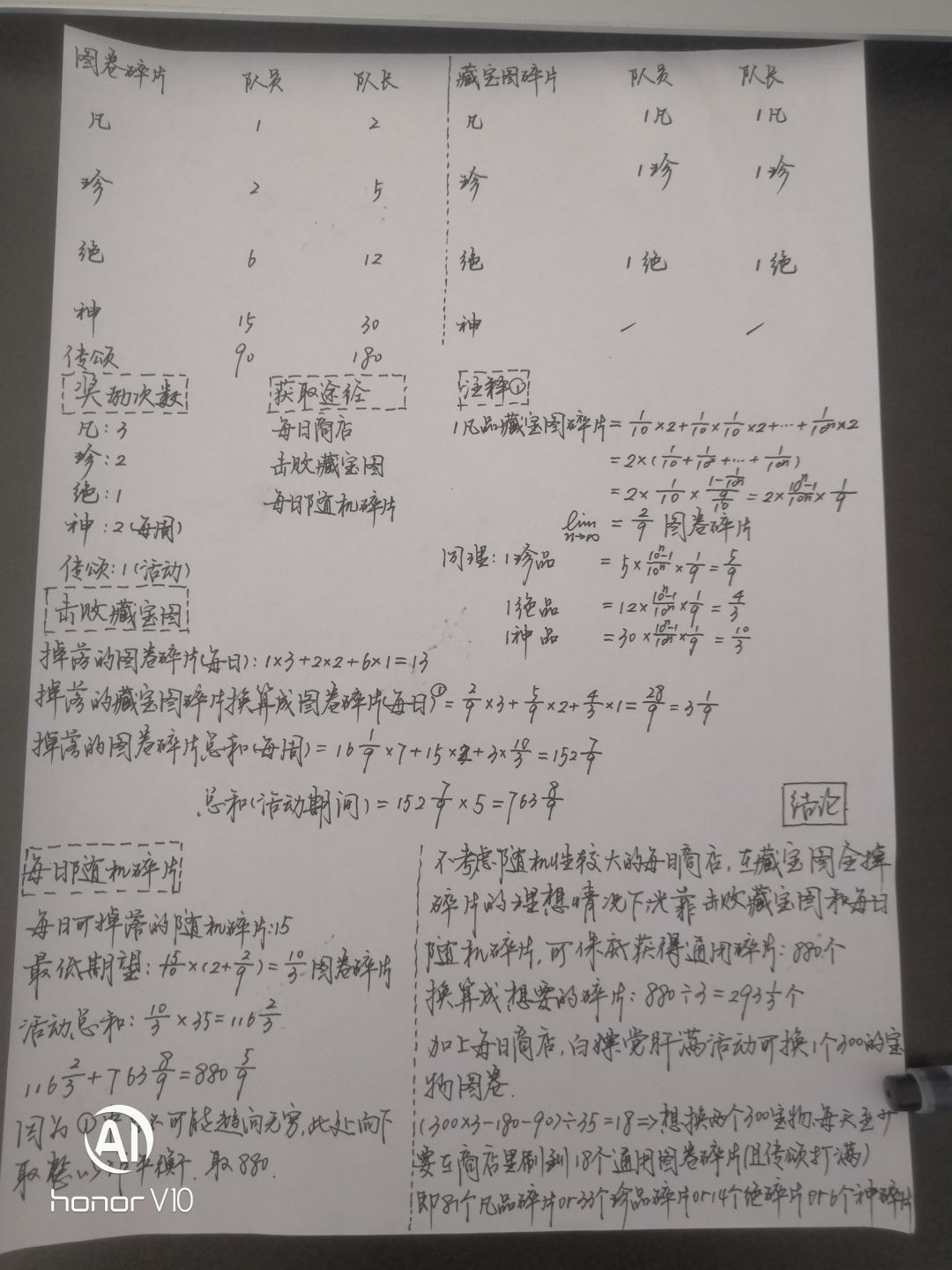 注:此攻略考虑的是所有藏宝图掉落均为无用的通用碎片的理想情况,但是藏宝图掉落还可能出现宝物图卷和有用的图卷碎片,这是无法准确预见的,因此攻略仅能给大家提供一个大概的结论,但总体上不会出现太大的问题。 先上结论,白嫖党肝满,不打传颂不出传颂,不考虑随机性的每日商店,活动可得880个通用碎片,相当于293个想要的碎片,所以算上每日商店,白嫖党肝满可以换一个300的宝物图卷。 如果想换两个300的图卷(