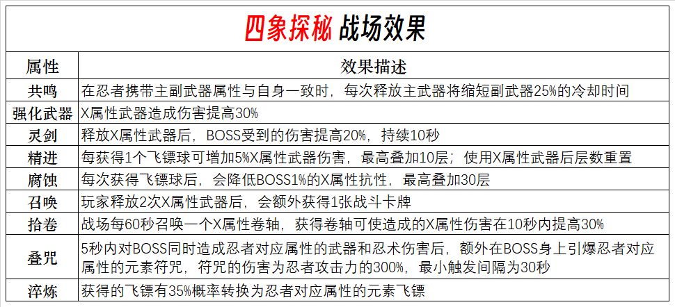1.不知道为什么四象探秘里面没有这些战场效果的名称,导致描述起来很不方便,但是改版后的天元战场是有这些效果的名称的,很多忍忍可能不打天元赛不知道,所以这里总结一下以便称呼; 2.新天元赛和四象探秘的战场效果不完全重合,目前未发现四象探秘有“连击”战场效果,而天元赛也无“叠咒”这一效果,该名称是从BUFF区得来 3.弱X和末日迷雾为固定战场效果,不再列出