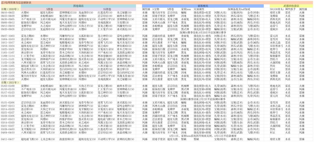 看了最新的公告,可能有些资源刷新规律会有变动(大概是家族商店和灾祸以及新难度) 以后再说吧,也不知道继续坚持做这表还有啥用 。。。 这是总表,刚好8个月的数据,图片可能被压缩看不清,所以没加水印 分区截图,主要还是家族商店信息较少,需要的话自行保留 就这样吧,其实我也快坚持不下去了