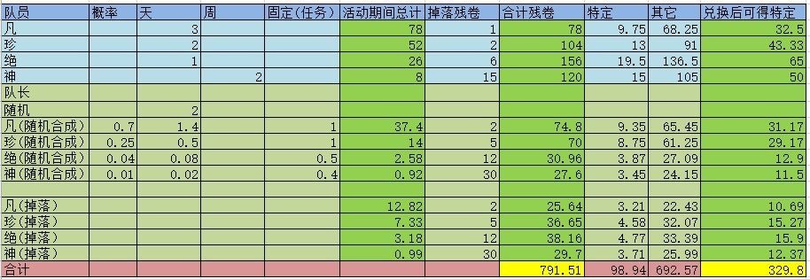 马上又要来到每年两次的藏宝图活动了,本次为大家带来藏宝图的预先攻略(正式版会等周四上线再发) 图一是本次藏宝图的藏品预测(重要宝物均已标红) 图二是本次活动白嫖情况下能获得的碎片数量 图三是根据图二计算的藏宝图规划 图四一些藏宝图的特性和本表格的计算方法 PS:计算应该不会出现较大误差,表中的规划均为极端情况下的推测,实际情况会减去一些花费 最后祝大家每张藏宝图都能爆出4倍幸运,能换到自己想要的图