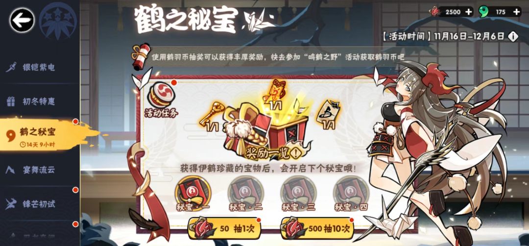 分级抽奖类(异鬼) 四个池子各100抽,抽全三个珍藏才可进下个池子,400抽满了之后无限池基础材料 勾玉花费按每50个12,16,20,逐渐上涨到24后不变 界面白嫖:14+14+14+14+14+40=110 活动白嫖:338 完全不用买即满 1)登录1,3,5,7,10 2+2+2+4+4=14 2)悬赏奖励5,10,20,35,50 2+2+2+4+4=14 3)通灵巡逻3,6,10,15,