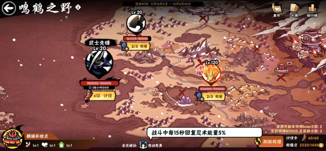 异鬼入侵 主要为鹤之秘宝提供兑换币,也会爆出其他材料和图卷,主要统计提供抽数 61.8+162+50.7+64=338.5抽(不花勾玉) —————————————————————— 一.体力: 1)支援点:初始1440,回复速度60/每小时,上限1440,用于世界boss 自然回复(固定360一次,以次为单位):495/6+3=85.5 补充:每日可打两次低于专属等级boss不消耗支援点2*21