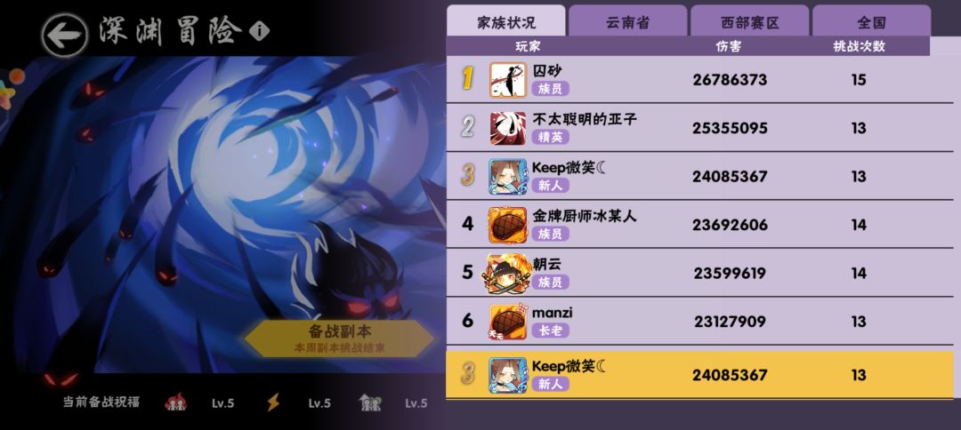 这周本来是想冲击54层的٩( ᐛ )و ,结果好像大家都去过中秋了,混了几把就离线了,导致后面人员流失严重,这周也再次止步于52层,希望我们能早日摆脱这种魔咒,也因本次的摆烂成员我们收到了族员反馈,我们再次清除了一部分摆烂成员((◦`~´◦)。 而且今日的boss也很折磨,不是隼白就是血影,甚至于46层的红龙就开始略显乏力,个别队伍开始掉次数(⑉꒦ິ^꒦ິ⑉)。同时也再次恭喜“囚砂”大佬再次夺下深