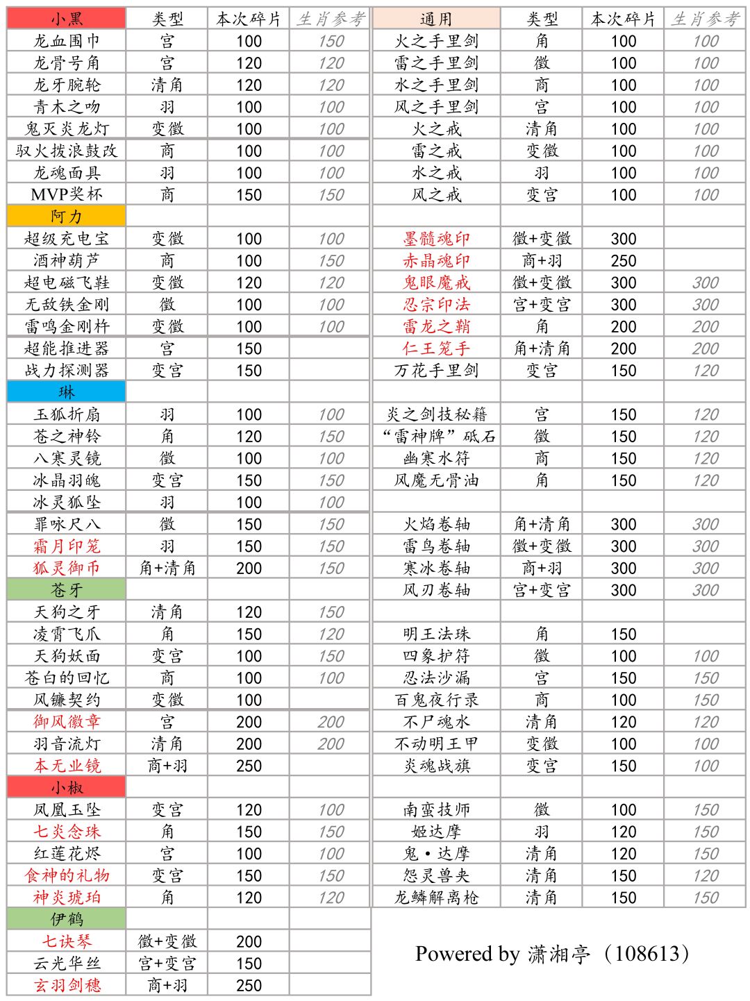 ps. 1.与上次生肖活动相比,本次所有宝物碎片均可在商店兑换。回收兑换比例依然为3:1。 2.表格提供了上次生肖活动兑换宝物所需碎片数作为参考。 3.部分宝物所需碎片数量提高了一个等级,大部分碎片数量没有变化,部分不常用宝物碎片数量降低。 4.帖子莫名其妙403了。