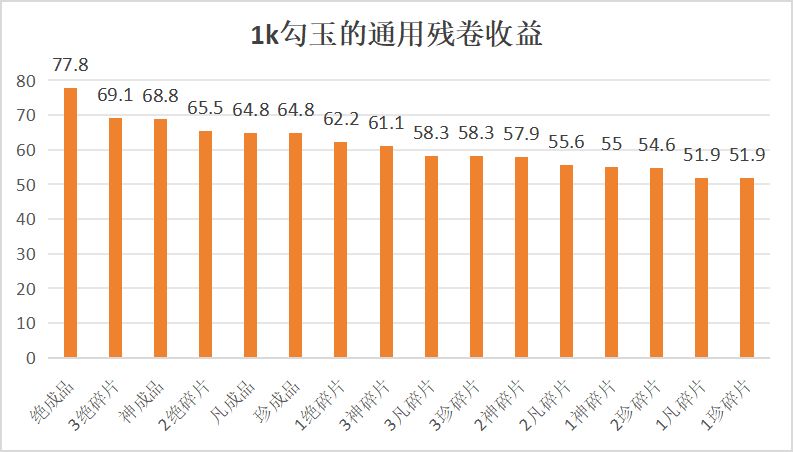 前言 本期,将对商店内勾玉商品的性价比进行十分细致的梳理~[表情_期待] 当然,由于本期内容过于理论,小伽暂不打算将之列为藏宝图正传的一部分,重要性也有限,各位看官图一乐便是~[表情_举手] 一些重要假设 一个客观存在的事实是:花费400勾玉购买绝品,击杀固定掉落1片绝品碎片+16属性残卷+20通用残卷 曾几何时,玩家群体观察上述事实得出结论:勾玉成品的性价比为400勾玉换取28通用,(由于10片