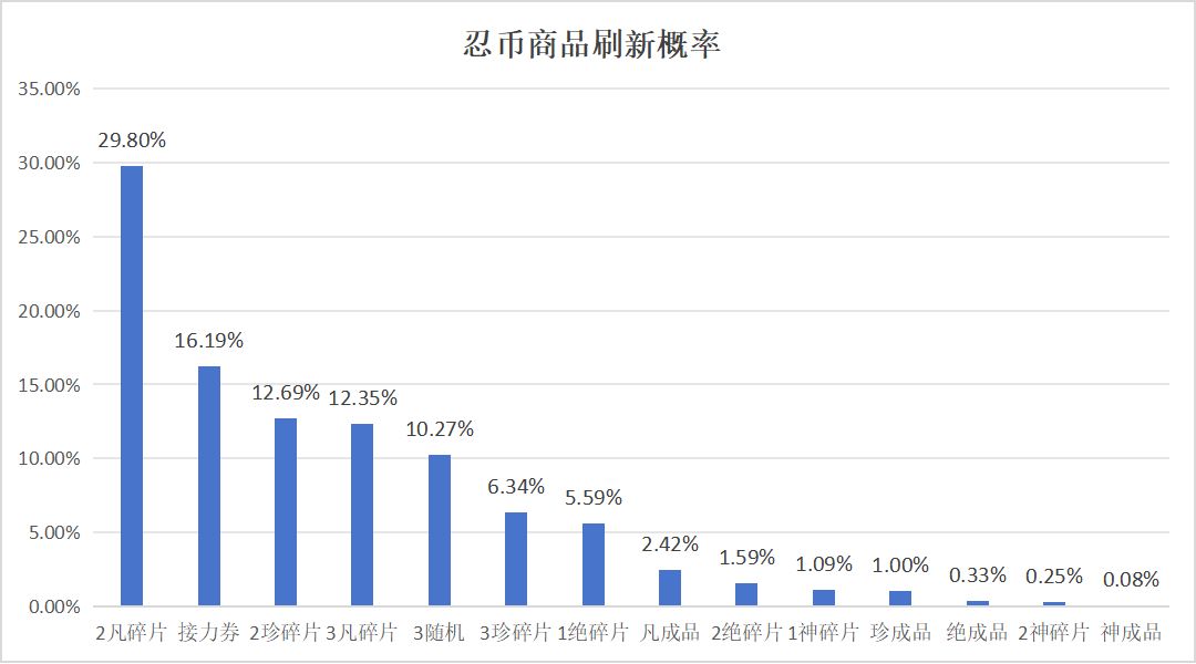 前言 本期,将量化刷商店的性价比,打破外界质疑!黑子说话![表情_微笑] 数据展示 本次周年庆藏宝图,我与十余位忍忍共同努力,拟合了忍币商品的概率分布,一共收集到1198份数据,结果展示如下~ 首先解释一下“收益”这一列的含义 按照可获得的通用残卷数量,以1片凡品碎片为最小单位,进行转换:1绝碎片=2珍碎片=4凡碎片,1神碎片≈7凡碎片,1随机碎片≥1凡碎片,1成品=10碎片 例如,1198份数据