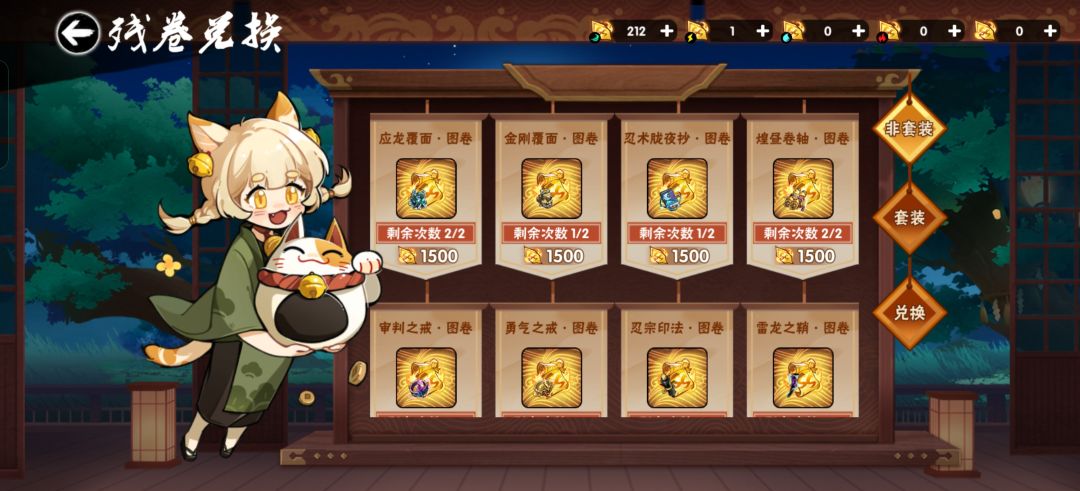 感谢伽罗瓦大佬的攻略,每天白嫖拉满未出传颂,4910勾两1500通用,溢出属性碎片213片 18天刷新2次:18×40=720 4天刷新4次:4×100=400 勾玉购买神品3张:3×800=2400 勾玉购买绝品3张:3×400=1200 勾玉购买两次绝品碎片2张:2×95=190 总计:720+400+2400+1200+190=4910 计划下次藏宝图前半程每天刷新两次不买任何成品,后半程看