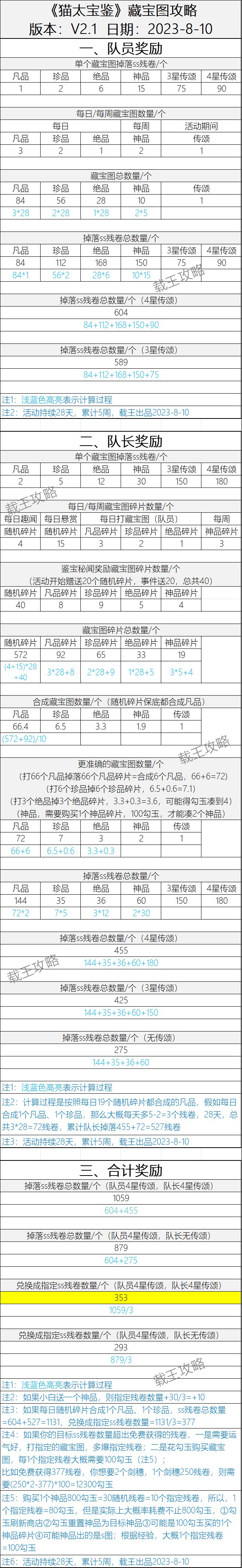 马上又要来到每年两次的藏宝图活动了,本次为大家带来藏宝图的预先攻略(正式版会等周四上线再发) 图一是本次藏宝图的藏品预测(重要宝物均已标红) 图二是本次活动白嫖情况下能获得的碎片数量 图三是根据图二计算的藏宝图规划 图四一些藏宝图的特性和本表格的计算方法 PS:计算应该不会出现较大误差,表中的规划均为极端情况下的推测,实际情况会减去一些花费 最后祝大家每张藏宝图都能爆出4倍幸运,能换到自己想要的图