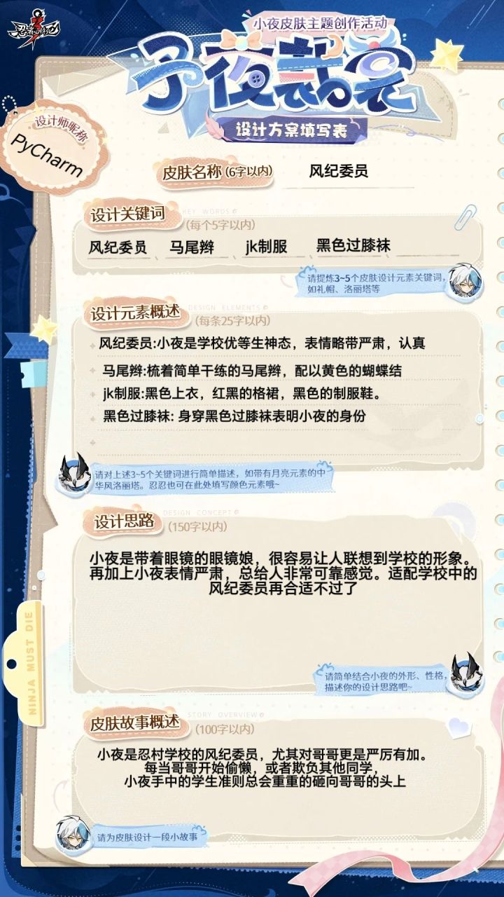 最近几日,夜枭小队的成员总见到自家队长对着一张空白的设计手稿犯难……身为兄长的银枭欣慰地见证了妹妹小夜的成长与蜕变,为了庆祝小夜如今能够独当一面,他决定送给妹妹一套量身定做的新衣作为礼物。然而术业有专攻,在情报网中游刃有余的银枭面对服装设计图纸却犯了难。于是,银枭特向广大忍忍发出邀请,愿忍忍们能助他一臂之力,为小夜构思一套独特的皮肤主题。主题不限、元素不限,忍忍们的创意将成为这份礼物最关键的一
