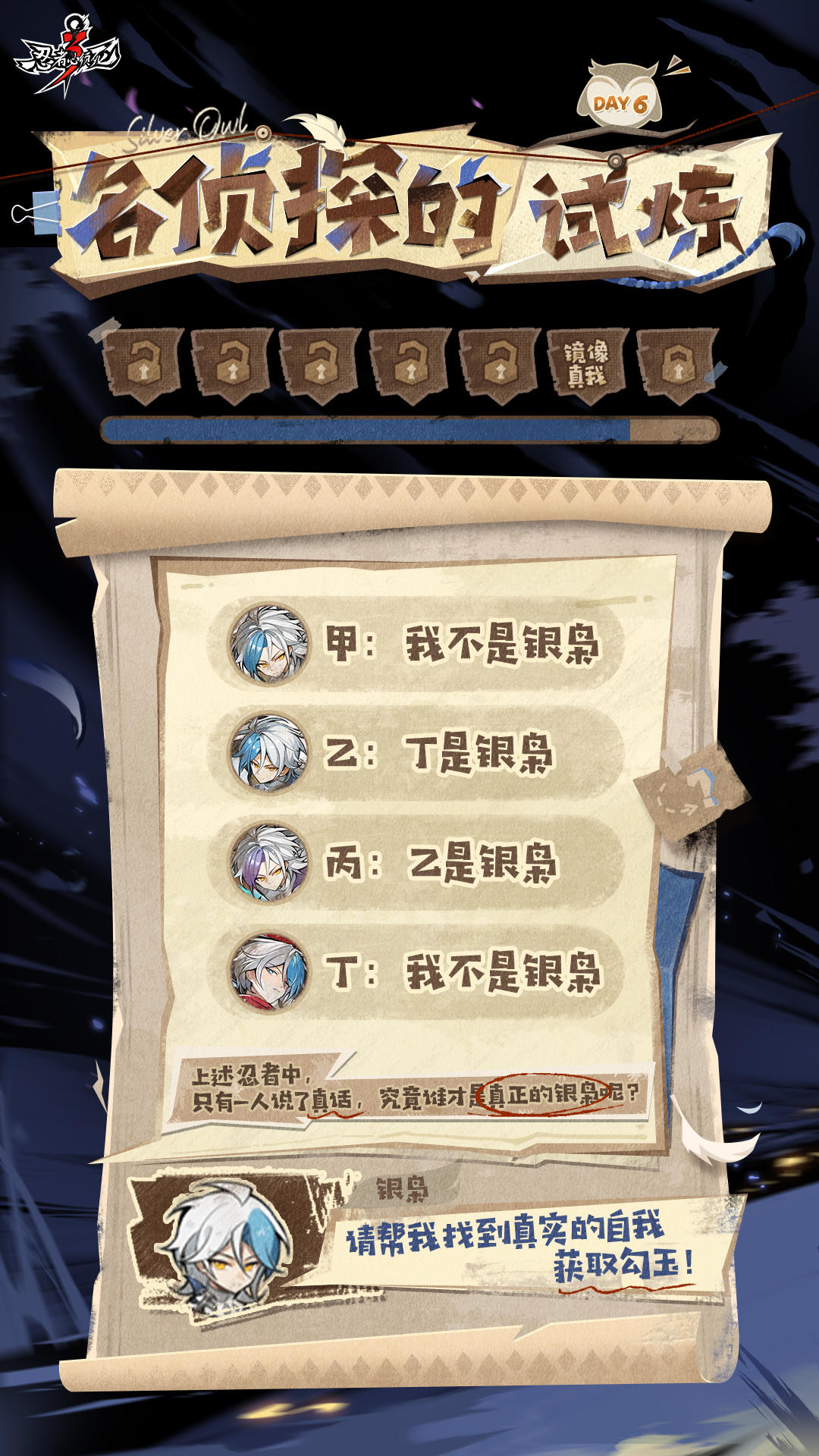 1月24日~1月30日,为期一周的「推理主题活动」正式开启!迷雾笼罩的忍界十字街坐落着一家推理俱乐部,银枭、隼白两名创始人正在筹备招生计划……为了甄选全能侦探,他们准备了有趣的谜题等待忍忍们前来挑战,快来完成推理吧!今日关卡:镜像真我!【参与方式】找出真正的银枭,并在评论区附上推理过程以及自己的uid,即为参与成功!【活动奖励】忍尔摩斯奖(1名):选取最快推理出正确答案的忍忍送上【勾