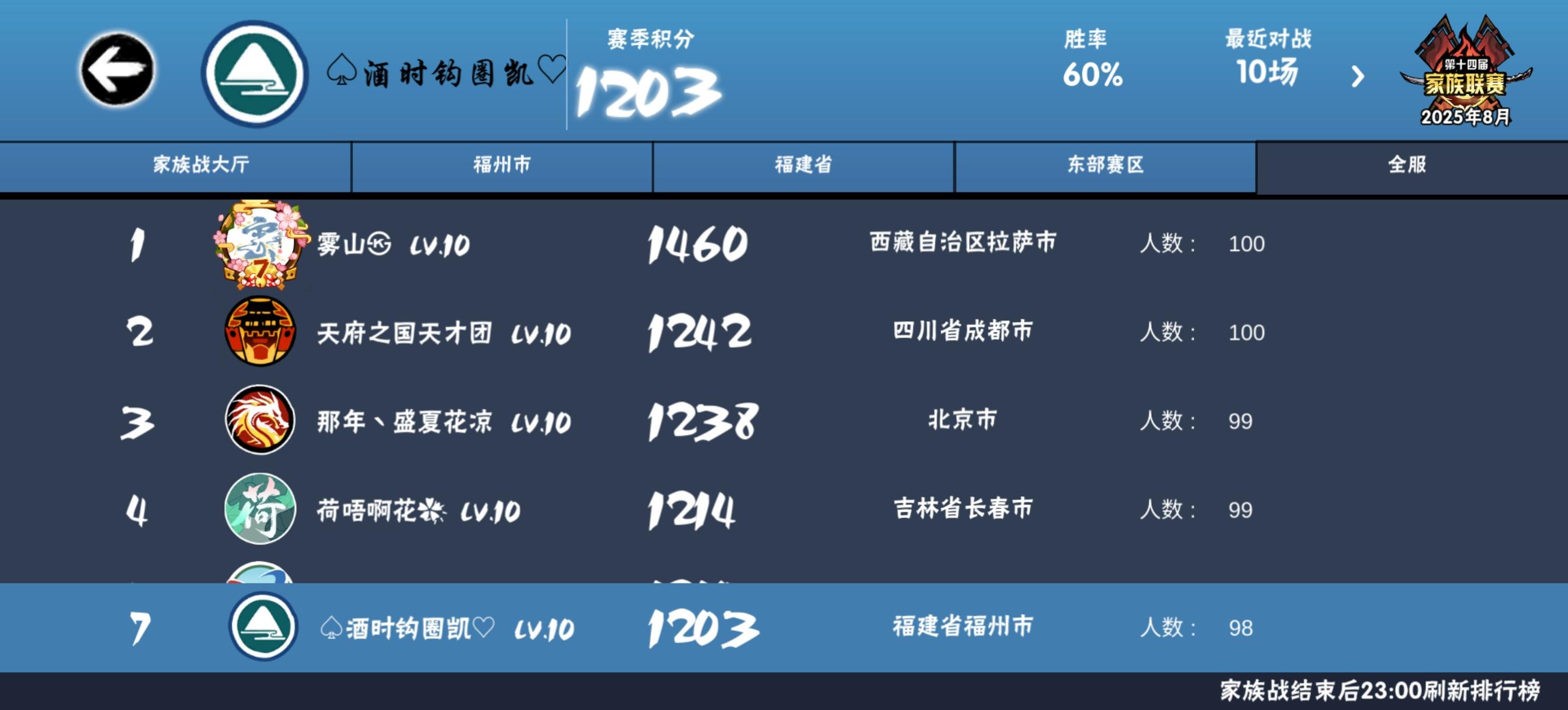 家族介绍:深渊常规67层左右超级周69 气氛温馨活跃 百人大战深渊(期待你的到来) 本赛季冲前十(目前排名在第八左右) 福利:活跃就有周 配置够可帮打活动排名/无双/天元前千 /剧情 不定时抽jjc/神行五/神龙/小礼包 高顶配需要其他福利可以进审核详谈 要求:配置主c命格664以上 手法大帝/能当队长可以适当降低配置要求 深渊拉满没空找机甲 家族接待qq群 937418253