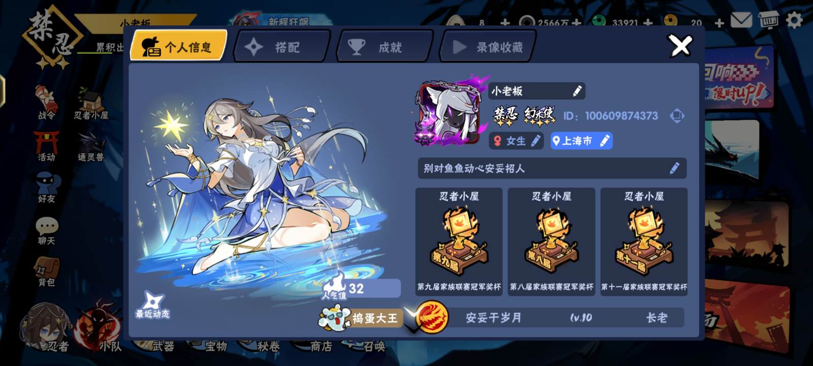 稀里糊涂入坑也快两年多了,记得刚开始玩只是无聊手机内存不够,所以选择了忍3,从开始的激情游戏慢慢淡化成日常机器,很无聊,所幸认识了一群朋友,让我慢慢玩了下去,后面呢,朋友一个个退游,家族也沉寂了,自己亲手解散,这是第一次退游,后面认识了一个二区的朋友,每天可以联机打33,又让我找回了一些刚开始的激情,虽然匹配有时间很漫长,但是有朋友打趣,也不算那么无聊,刚入坑的时候汤圆大神三连冠,很仰慕,顾辞是我