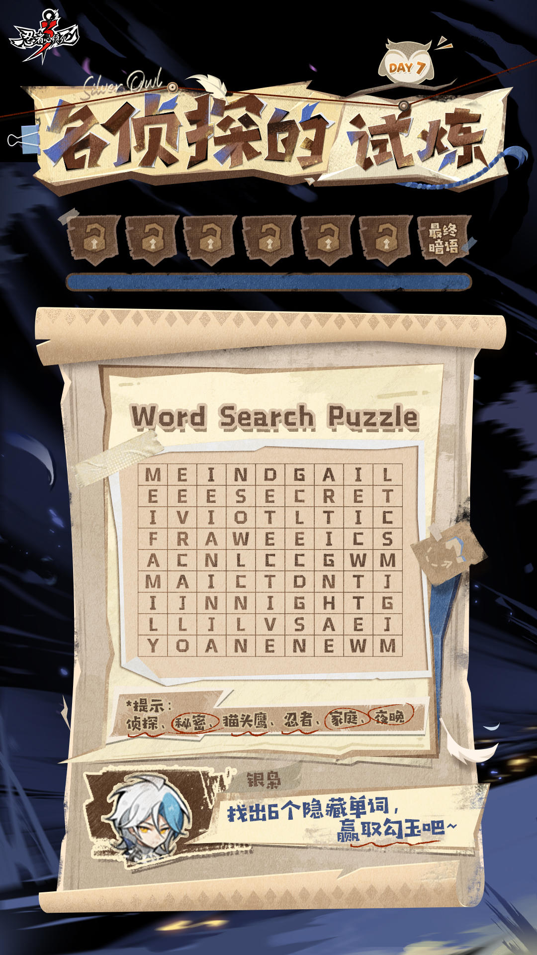 1月24日~1月30日,为期一周的「推理主题活动」正式开启!迷雾笼罩的忍界十字街坐落着一家推理俱乐部,银枭、隼白两名创始人正在筹备招生计划……为了甄选全能侦探,他们准备了有趣的谜题等待忍忍们前来挑战,快来完成推理吧!今日关卡:最终暗语!【参与方式】step1:保存图片,根据所给出的提示圈出6个隐藏单词;step2:完成推理后,将图片发送至评论区,并附上自己的uid,即为参与成功!【活
