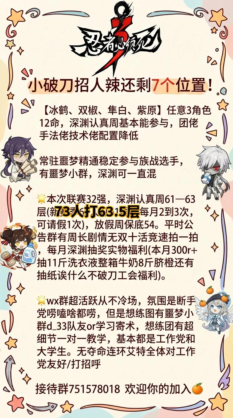 二区联赛季军战队🏆 深渊新赛季火热开启🔥 广纳贤才,共赴荣耀! 【孤鸿杳杳起风雨,广纳人才,虚左以待】✨ —————————————— 【🎯招募要求】 1️⃣深渊全勤 · 常驻型中高配玩家 🥷主流忍者命格需达 6+6+4 标准 2️⃣团本练习生 & 33竞技选手 ⚔️ 🌟招募潜力新人,可适当放宽配置要求 —————————————— 【❤️家族优势】 ✅三年稳健运营,管理成熟,