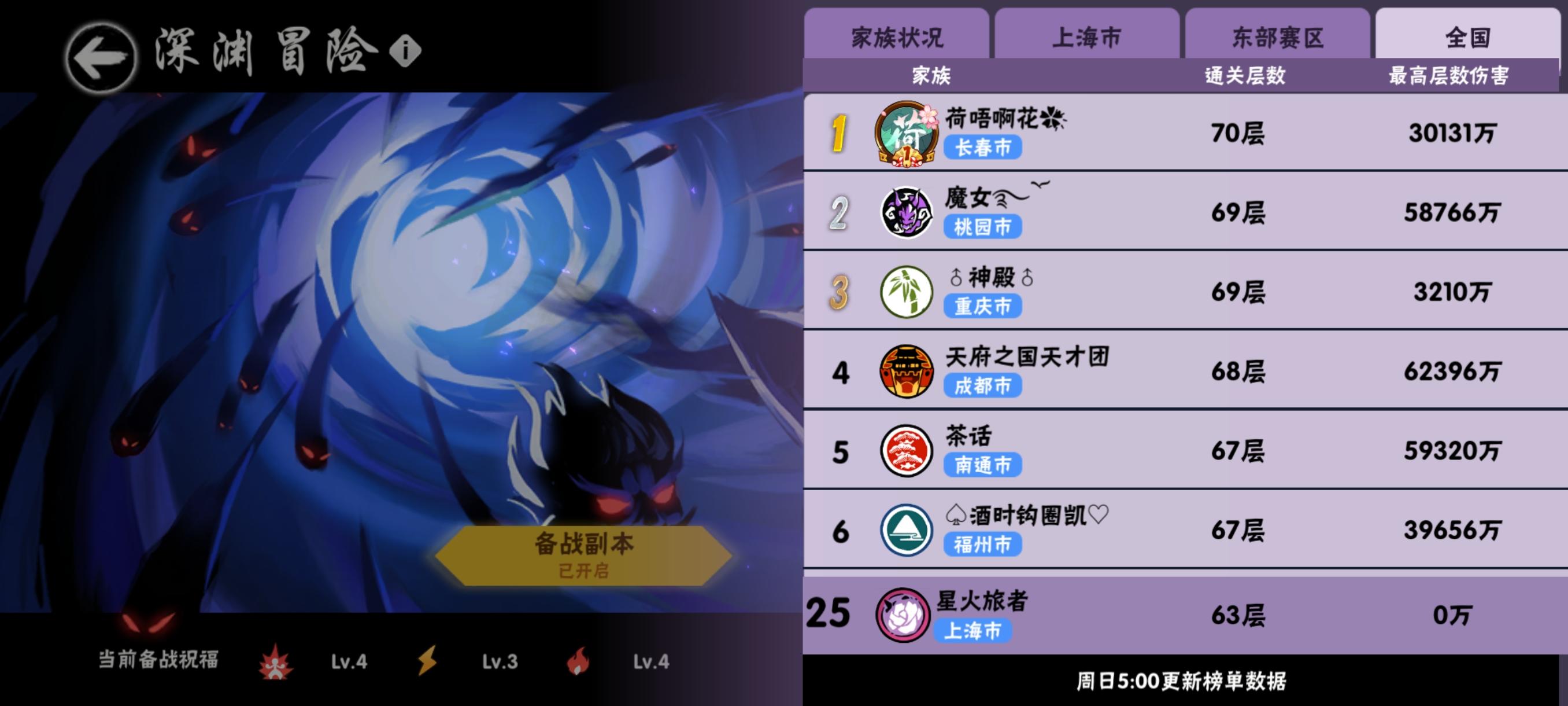 一区深渊家族招人,家族战稳定联赛入围看情况冲32 深渊层数稳定62+,除非过多请假 急需常驻深渊选手 家族主要打深渊,有意+q群920054001 曾经的输出要求至少过3000万,没有打出过3,000万可以进群发配置,管理能预估你打多少伤害的,需要听指挥,家族有分队 周六日管理会随机组织家族活动,提升家族氛围 配置要求 忍宗3+3+0/3+1忍宗+s忍抄 加几个可用角色 还没打出