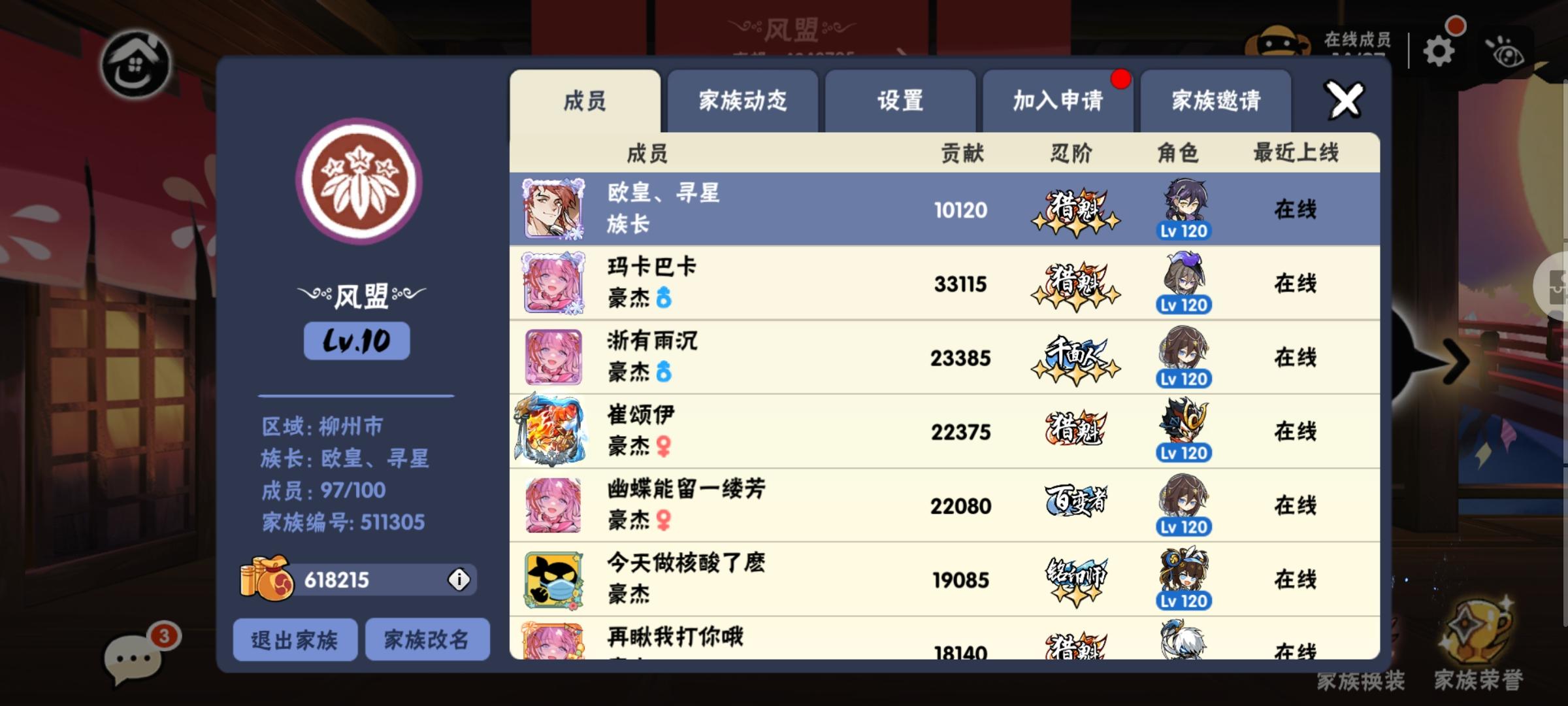 家族特招,聊天活跃的忍忍!家族福利: 1带鬼族,乱斗,周末活动头像框 中高配包周 还有所有活动的头像框和头像2.家族免费双银头 要求1.深渊家族不要求打家族战,家族氛围超级融洽,每天都有2000条消息 2能正常的深渊,配置要求水鹤、双娇532、白、卫、紫633,或者,深渊能开三大(特殊情况也可请假)
