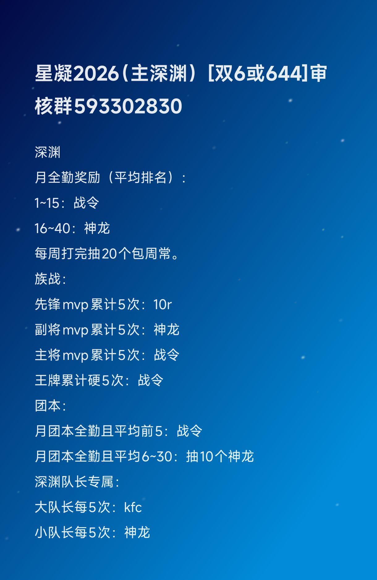 深渊/族战都玩,深渊62-64层,联赛32强。福利:拉满深渊包周常,有事可适当请假,高顶配包33无双/天元前千,剧情和逆袭头像,其他成员享受超低剧情和逆袭头像,每周深渊还会根据排名有🧧/周边/剧情等大量抽奖 接待群:480888039