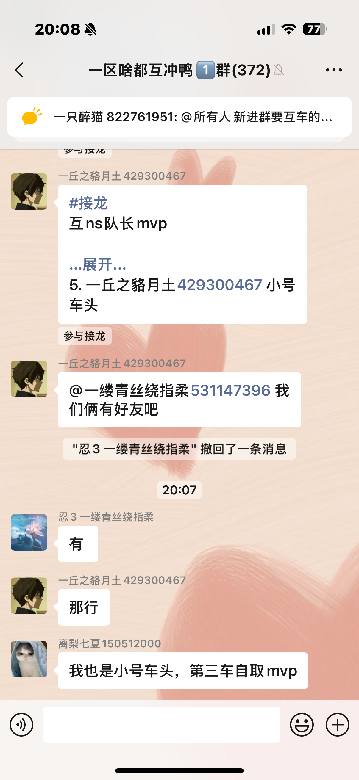 逆袭和传颂又要开始啦一区活跃玩家抱团取暖,欢迎进来一起互车。由于1️⃣群已经将近500人满群,所以特此开2️⃣群,直接进,追传颂,追逆袭,平时也可以追ss悬赏,互A+也行!祝各位欧气满满!