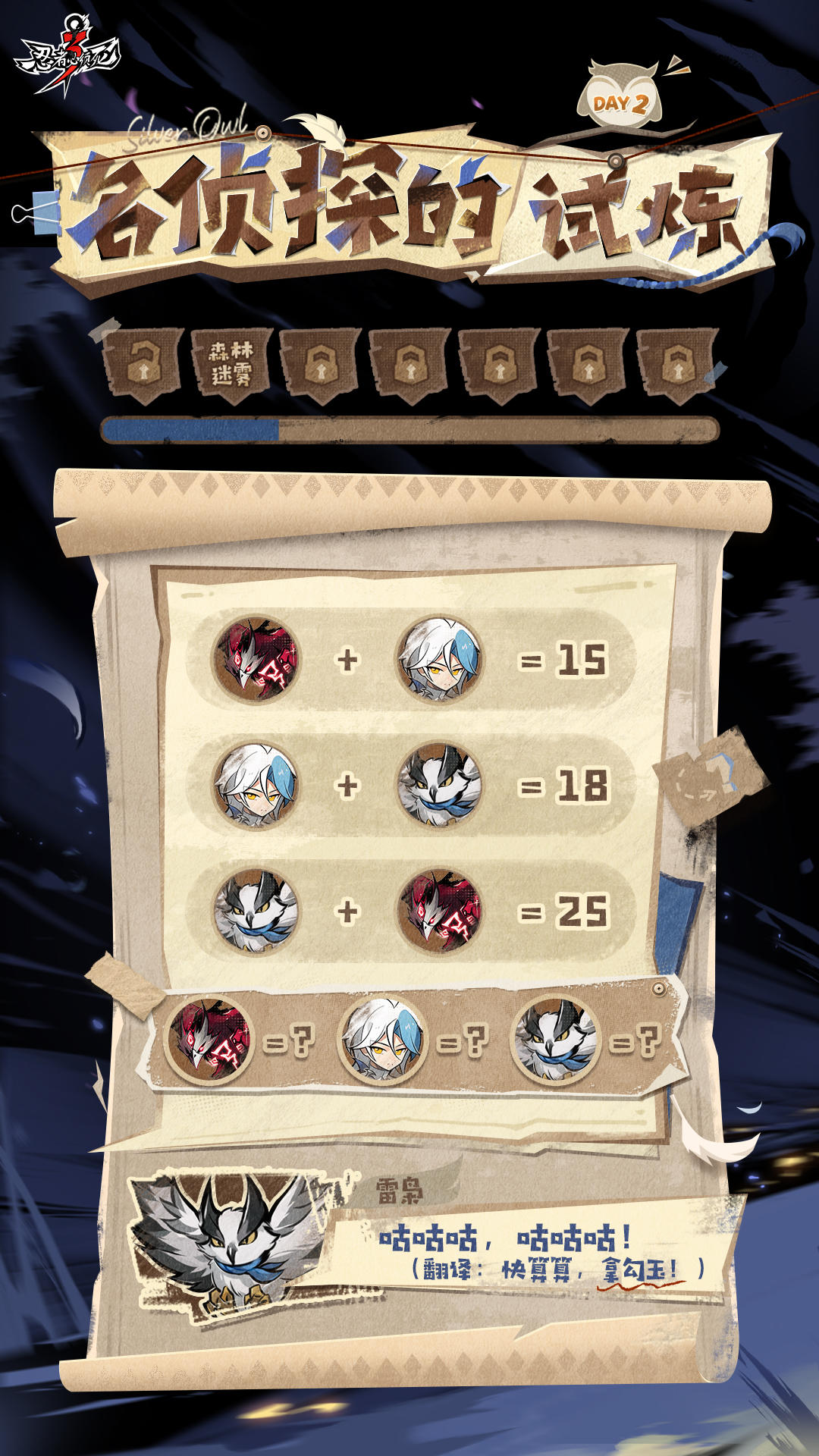1月24日~1月30日,为期一周的「推理主题活动」正式开启!昨日,忍忍们随银枭和隼白进入了思维宫殿,回到了紫原被阴阳师伏击的那一天……在忍忍的帮助下,紫原死里逃生,一起来看看今日的挑战吧!今日关卡:森林迷雾!【参与方式】step1:请根据所给等式,分别计算出八咫乌、银枭、雷枭的具体数值;step2:在评论区留言最终答案并附上推理过程,同时附上自己的uid,即为参与成功!【活动奖励】忍