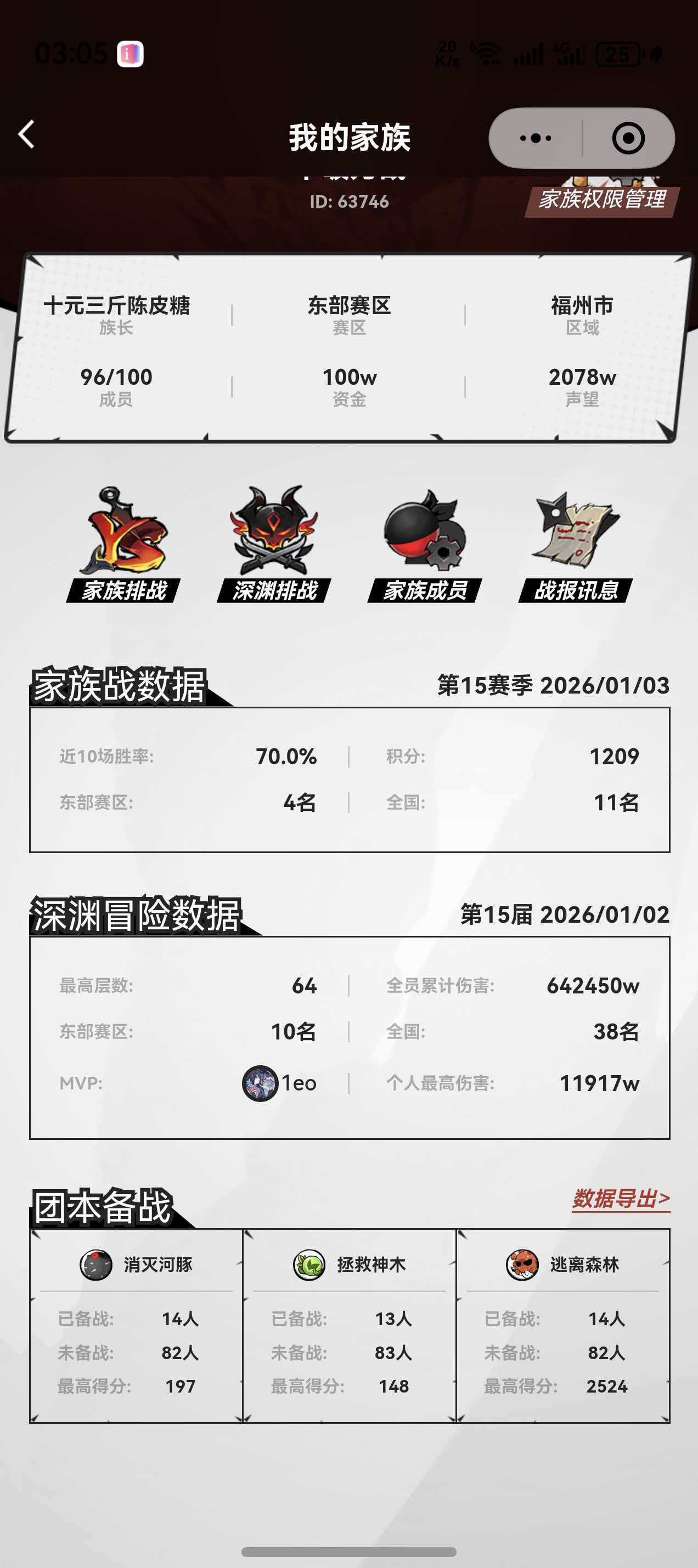 家族介绍:深渊常规67层左右超级周69以上气氛温馨活跃百人大战深渊(期待你的到来) 本赛季冲前十(目前排名在第八左右) 福利:活跃就有周,配置够可帮打活动排名/无双/天元前千 /剧情,不定时抽jjc/神行五/神龙/小礼包高顶配需要其他福利可以进审核详谈 配置:主c命格664以上,能当队长/能保队的大佬可以适当降低配置要求深渊拉满没空