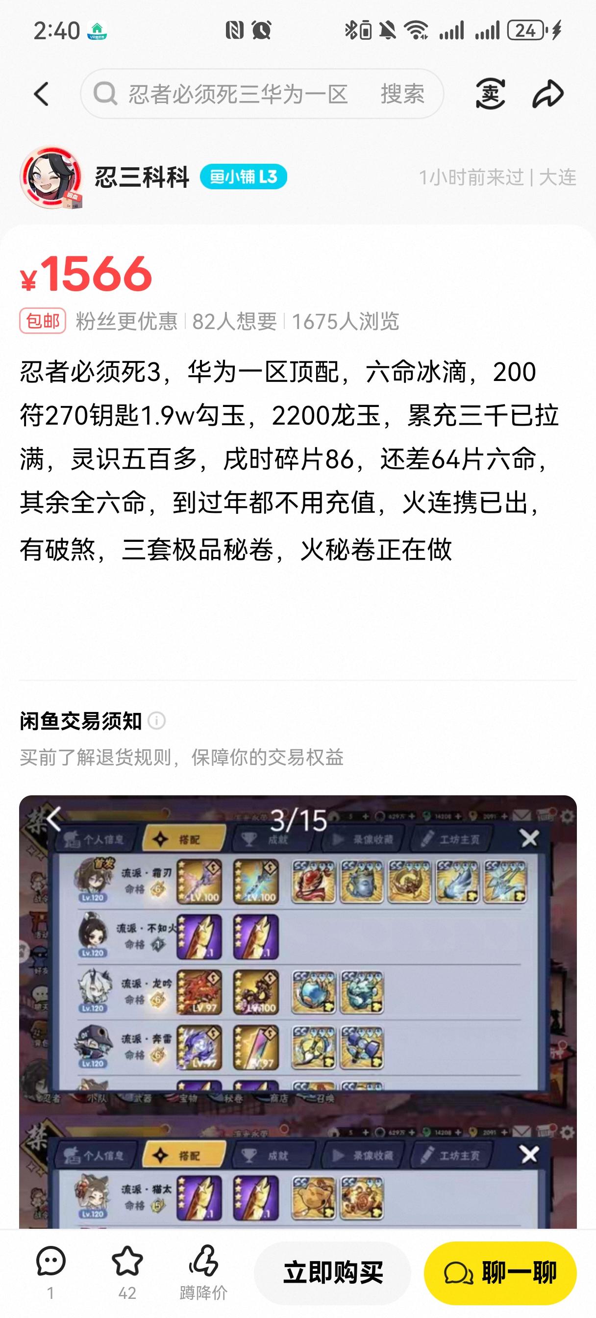 这什么时候盗的我图,我号都下架一个多月了,不打算卖了你盗我图骗人,想打压号价还是引流我不知道,反正闲鱼举报你没用,留言也给我拉黑,现在的号贩子一个比一个恶心,偷偷摸摸的盗图一句话不说挂我号,这号1500你不就是想打压号价吗?现在交易市场乌烟瘴气的全是这些号贩子不当人#忍者必须死3